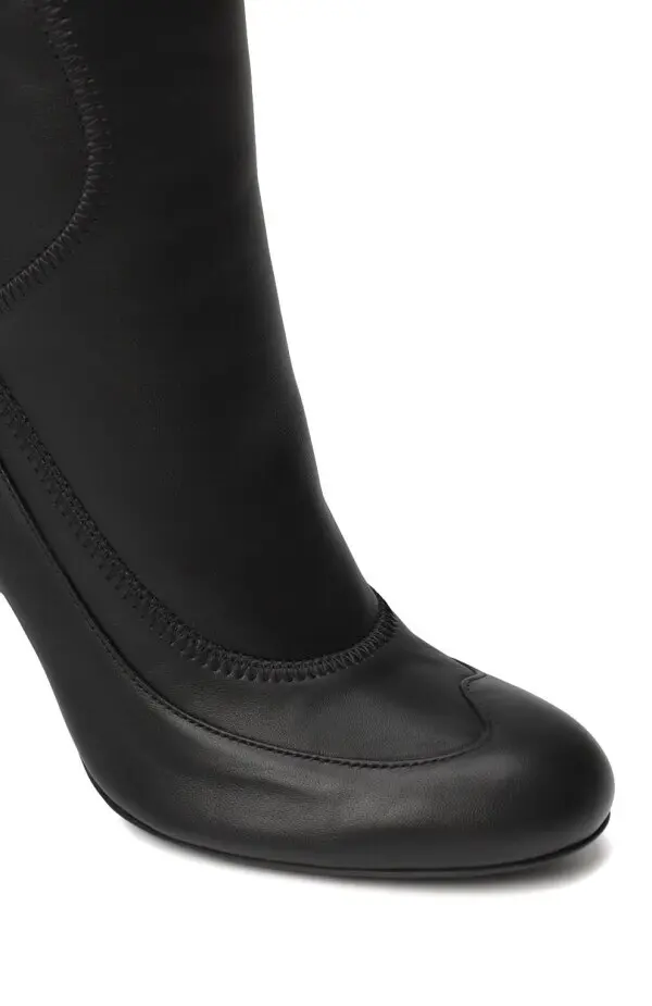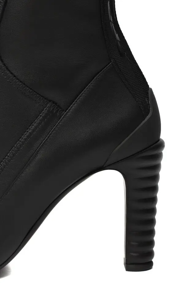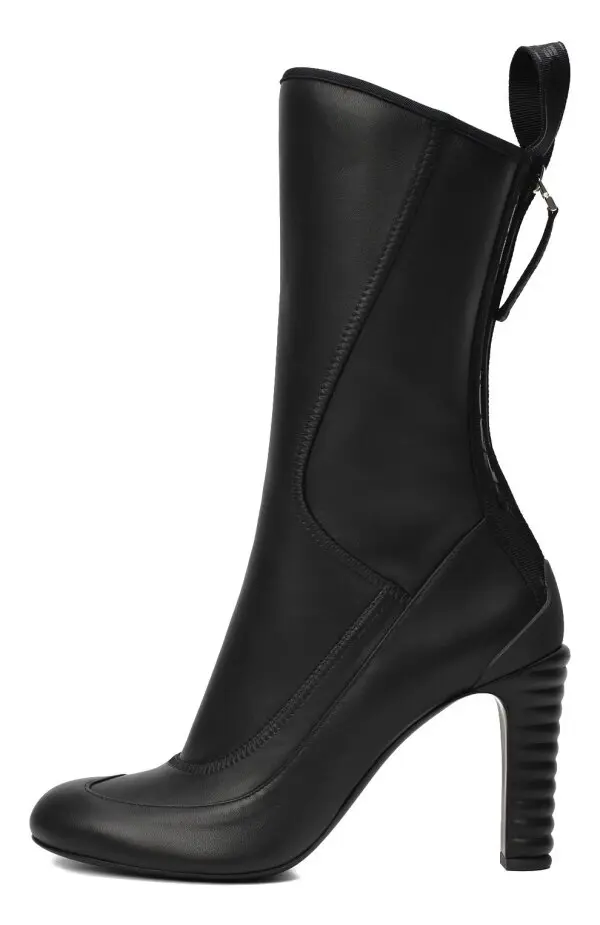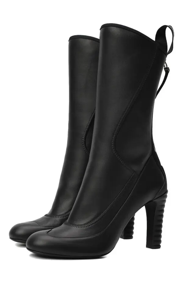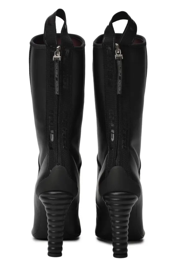 Сапоги Promenade от Fendi выполнены из мягкой чёрной кожи с гладкой фактурой, подчеркивающей минималистичный и современный стиль. Высокий силуэт дополнен округлым мыском и удобной молнией сзади, обеспечивающей лёгкость при надевании. Особое внимание привлекает рельефный каблук с характерной геометрией, который придаёт образу динамичность и изящество. Эта модель сочетает элегантность и практичность, делая её подходящей как для повседневных выходов, так и для особых случаев.