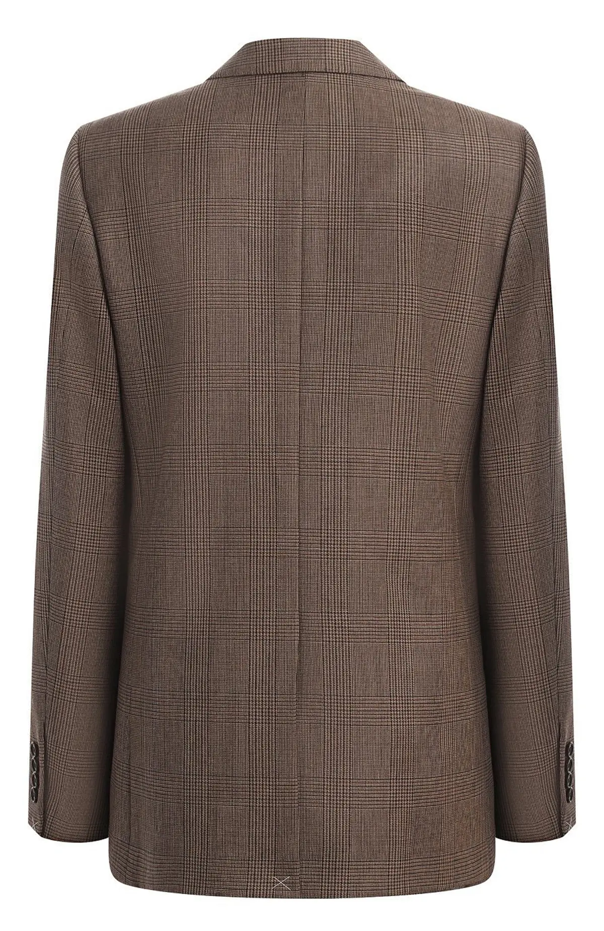 Коричневый шерстяной жакет Celine выполнен в классическую клетку, подчеркивающую элегантный и сдержанный стиль. Прямой силуэт, лацканы с острыми углами и застёжка на две пуговицы создают универсальный образ, подходящий как для деловых встреч, так и для повседневного гардероба. Фланцевые карманы добавляют практичности, а качественная шерсть обеспечивает комфорт и изысканный внешний вид.