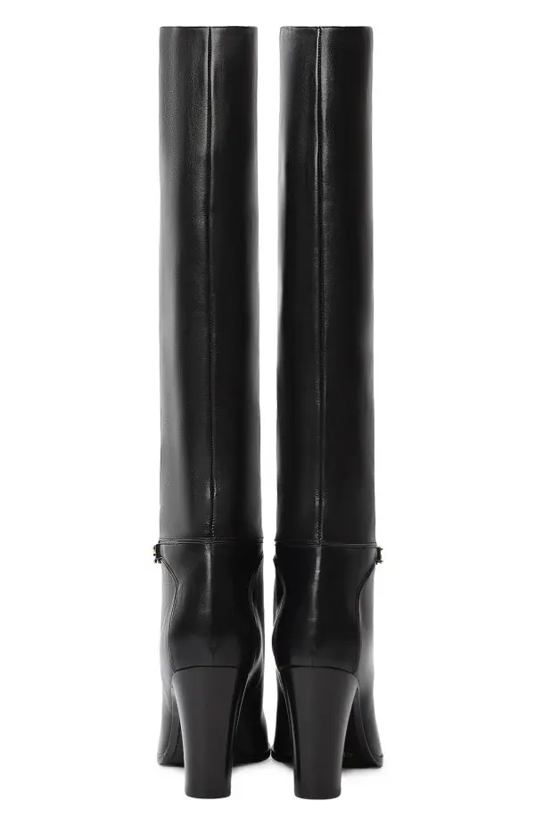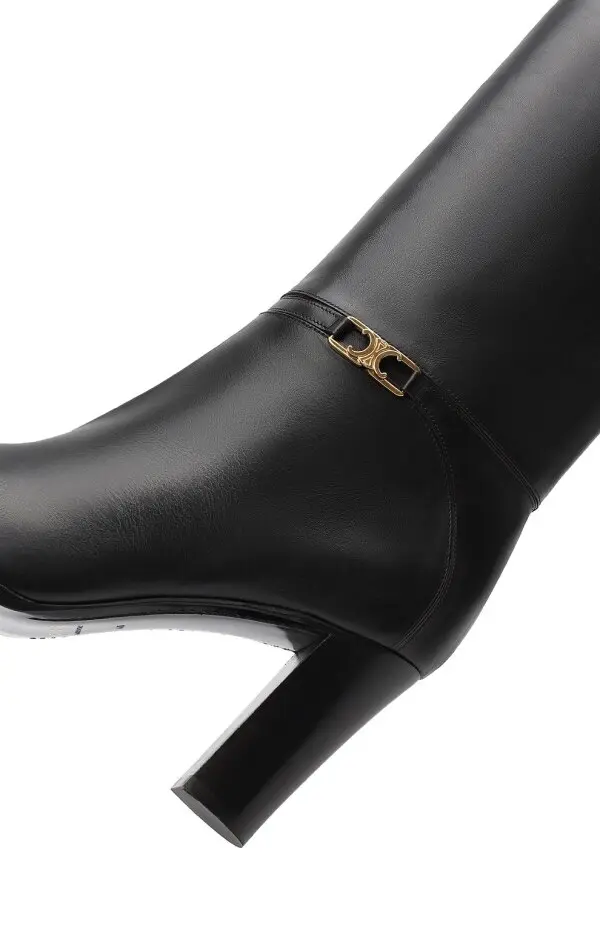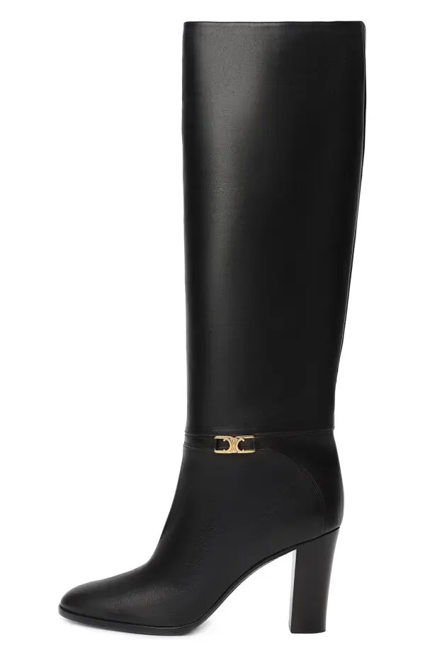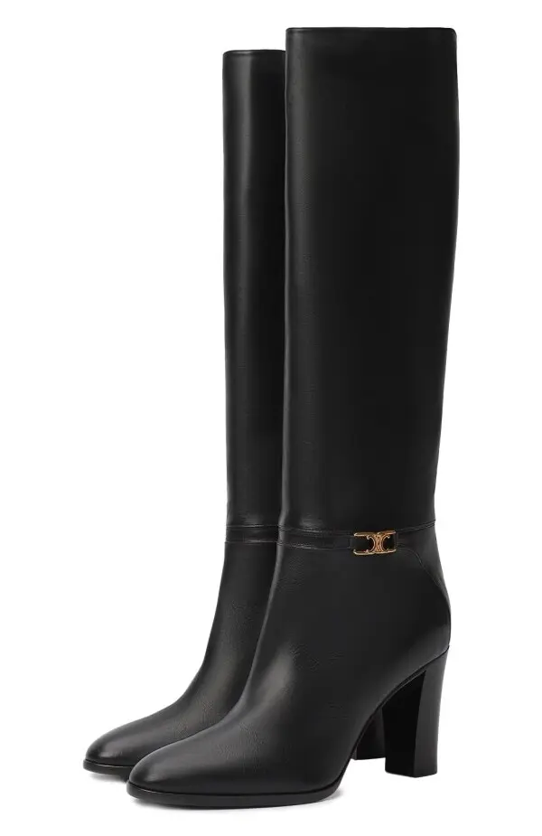Сапоги Claude от Celine выполнены из гладкой чёрной кожи и отличаются лаконичным силуэтом с высоким голенищем. Элегантный акцент создаёт золотистая пряжка с фирменным символом Triomphe, добавляющая изысканности классическому дизайну. Удобный устойчивый каблук средней высоты обеспечивает комфорт при носке, а округлый мыс сохраняет утончённость формы. Эта модель воплощает сдержанный люкс и подходит для тех, кто ценит одновременно элегантность и практичность.