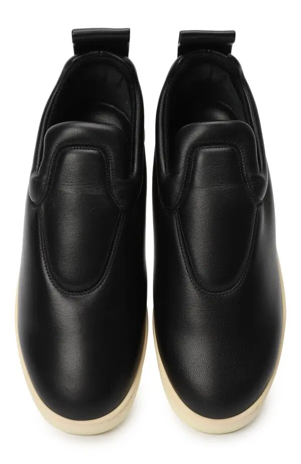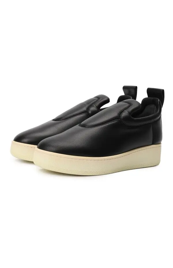 Слипоны Celine выполнены из гладкой чёрной кожи и отличаются минималистичным дизайном без шнуровки, что делает их удобными и практичными для повседневной носки. Эластичные вставки по бокам обеспечивают лёгкость надевания и комфорт при движении. Контрастная светлая подошва придаёт модели современный характер и добавляет свежий акцент. Эти слипоны удачно сочетают элегантность и спортивную эстетику, оставаясь универсальной обувью для любого гардероба.