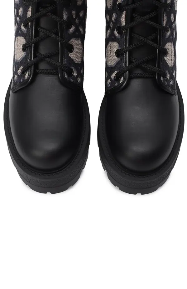 Женские ботинки D-Major от Christian Dior выполнены из сочетания прочной кожи и текстиля с культовым мотивом Dior Oblique. Высокая шнуровка и массивная рифлёная подошва придают модели характерный брутальный вид. На голенище размещена широкая вставка с фирменной надписью Christian Dior, подчёркивающей узнаваемый стиль бренда. Обувь удачно сочетает элегантность и функциональность, становясь ярким акцентом в современном гардеробе.