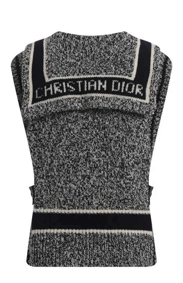 Эффектный жилет Dior выполнен из мягкой смеси шерсти и кашемира, сочетающей тепло, комфорт и легкость. Меланжевая фактура в черно-молочной гамме дополнена контрастной полосой и аккуратным воротником с V-образным вырезом, создающим благородный акцент. Модель станет стильным слоем в многослойных образах и легко впишется в гардероб в стиле casual chic.