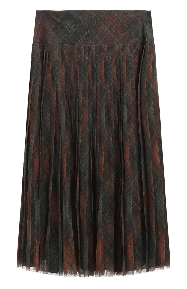 Юбка выполнена из лёгкого полупрозрачного материала с тонким тартанным рисунком в тёмных глубоких оттенках. Мягкие складки формируют воздушный силуэт и придают движению плавность. Плотный пояс обеспечивает аккуратную посадку и подчёркивает женственный характер модели.