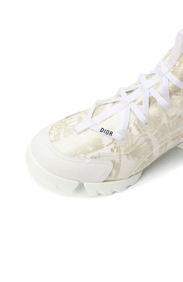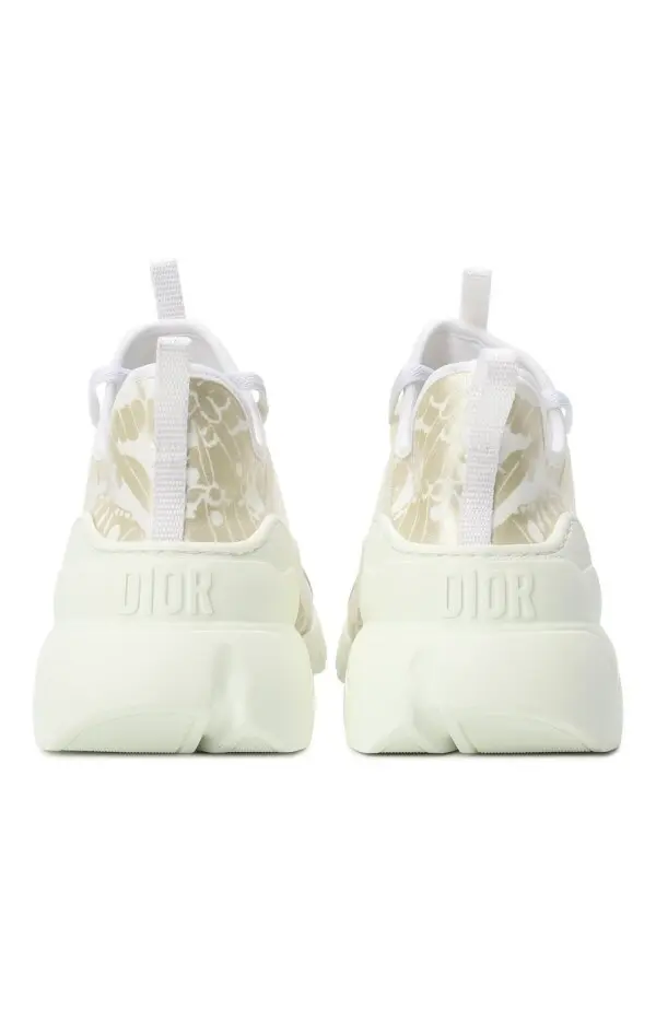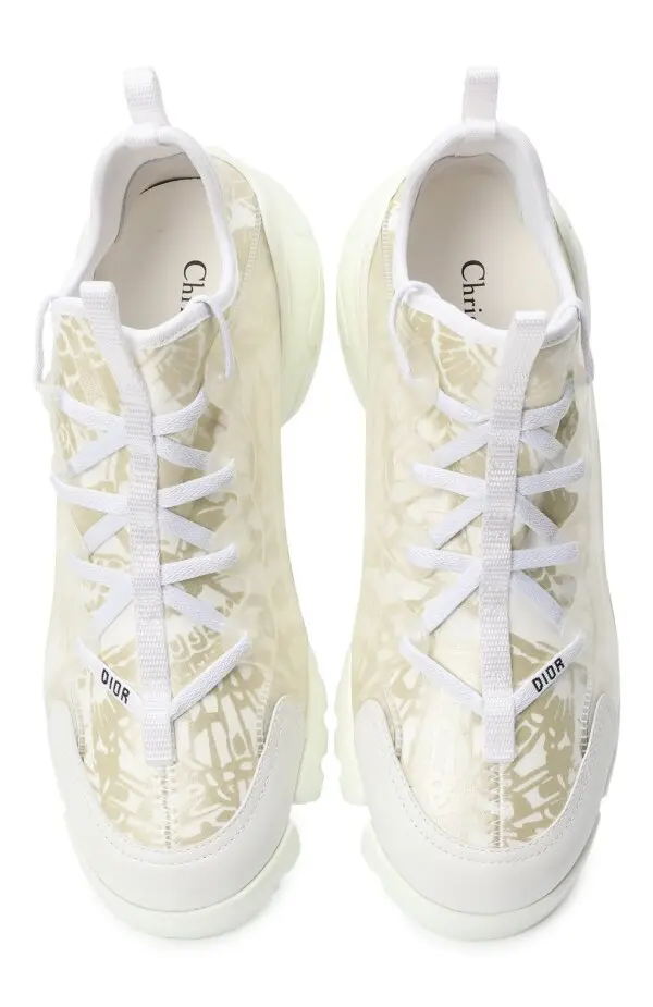 Кроссовки D-Connect Dior выполнены в светло-бежевом оттенке с полупрозрачным верхом, украшенным изысканным узором. Массивная резиновая подошва с рельефным протектором подчеркивает спортивный силуэт и обеспечивает комфорт при ходьбе. Белые шнурки и акцент с логотипом Dior на язычке завершают современный и стильный образ.