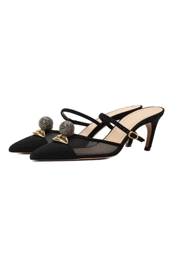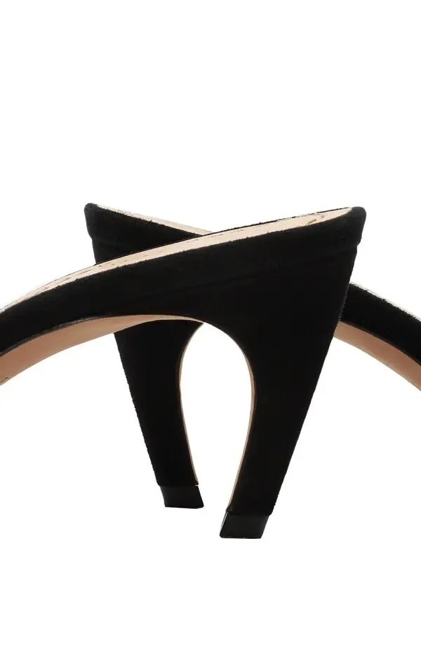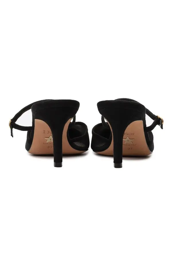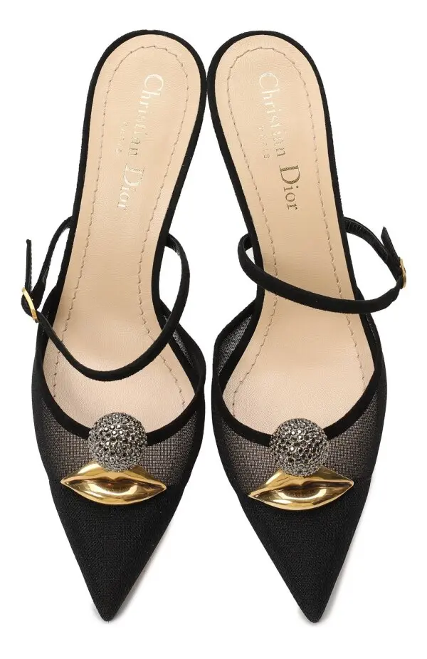 Мюли Surreal-D от Dior мгновенно притягивают внимание смелым и необычным дизайном. Прозрачные вставки из сетки и чёрный текстиль создают иллюзию лёгкости, а оригинальные украшения в виде золотых треугольных деталей с объёмными стразовыми шарами на мыске придают образу авангардный характер. Каблук средней высоты и изящные тонкие ремешки обеспечивают комфорт и безупречную посадку. Эта пара — настоящая арт-интерпретация обуви, где кутюр сочетается с экспериментальной эстетикой Dior.