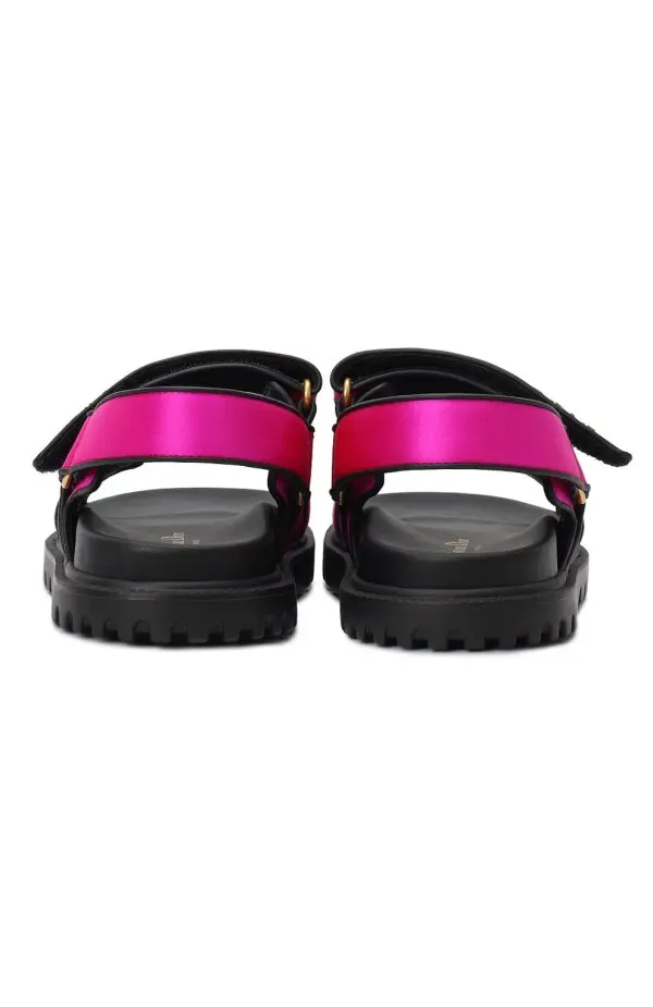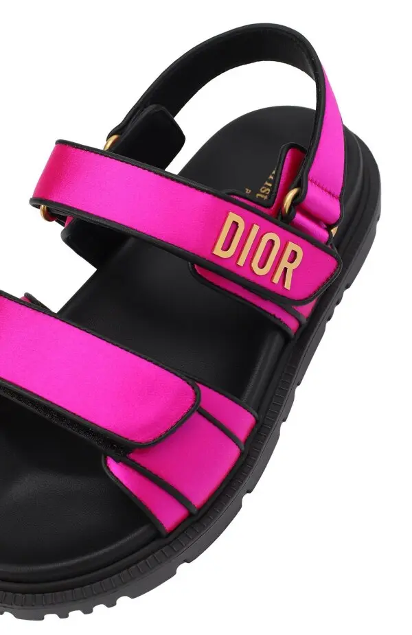 Сандалии DiorAct от Dior в ярком фуксия с чёрными акцентами созданы для смелых и стильных образов. Модель выполнена из сатинированного материала, дополнена массивной анатомической подошвой для комфорта и устойчивости. Два ремешка на липучке обеспечивают удобную посадку и украшены золотистым логотипом DIOR, придающим эффектный акцент. Сочетание дерзкого цвета и современного силуэта делает эти сандалии идеальным выбором для летнего гардероба.