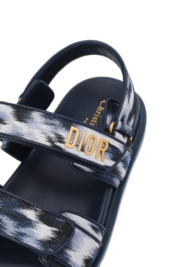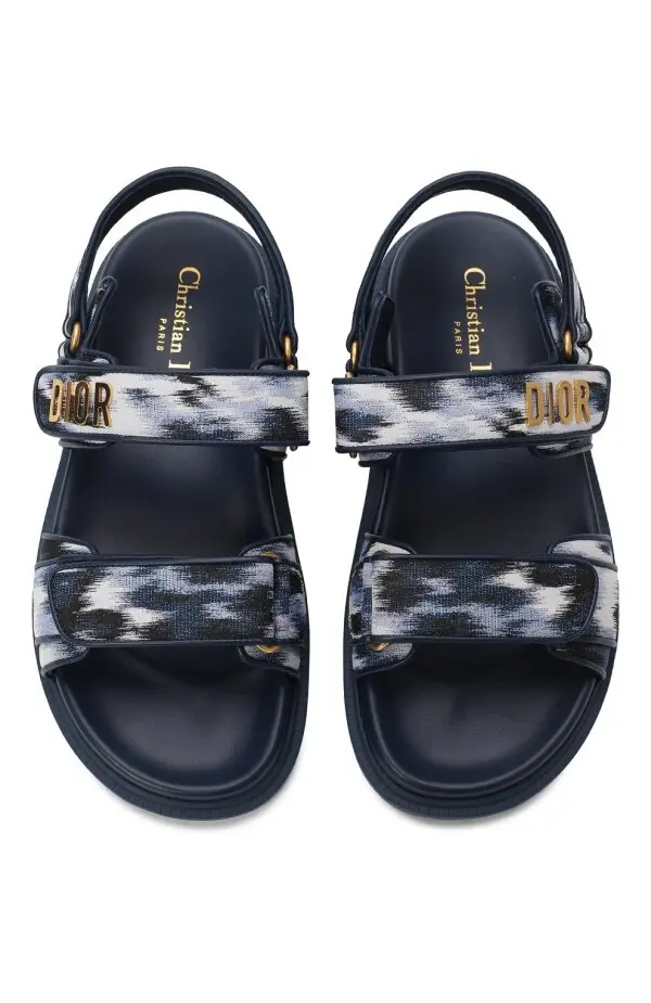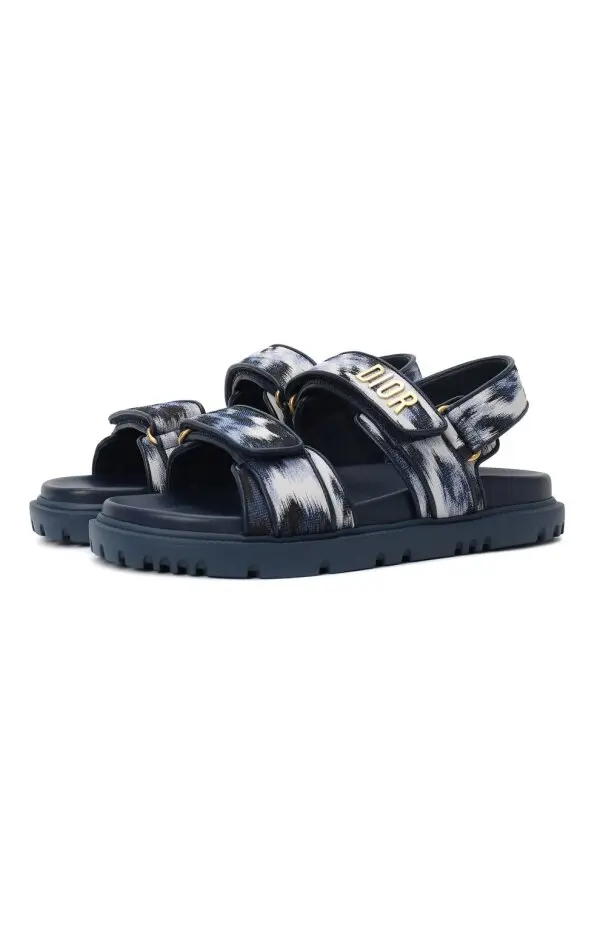 Сандалии DiorAct от Dior представлены в эффектном синем исполнении с художественным градиентным принтом. Модель выполнена с широкой кожаной отделкой и массивной подошвой, обеспечивающей комфорт и износостойкость. Два регулируемых ремешка на липучке украшены золотистым логотипом DIOR, создавая яркий и современный акцент. Эти сандалии удачно сочетают удобство и креативный дизайн, добавляя стильный штрих к летнему образу.