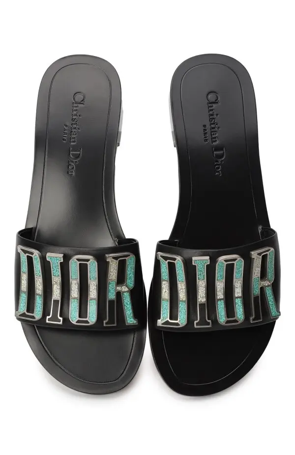 Шлепанцы Dio(r)evolution от Dior — это смелая и современная интерпретация летней обуви с акцентом на фирменную эстетику Дома. Модель выполнена из гладкой черной кожи с широкой перемычкой, украшенной массивной металлической надписью “DIOR” с инкрустацией бирюзового и серебристого оттенков. Контраст строгой формы и яркого декора делает эти шлепанцы эффектным элементом гардероба. Плоская подошва обеспечивает комфорт, а минималистичный силуэт подчеркивает универсальность модели. Такой аксессуар идеально впишется как в повседневные, так и в расслабленные курортные ансамбли.