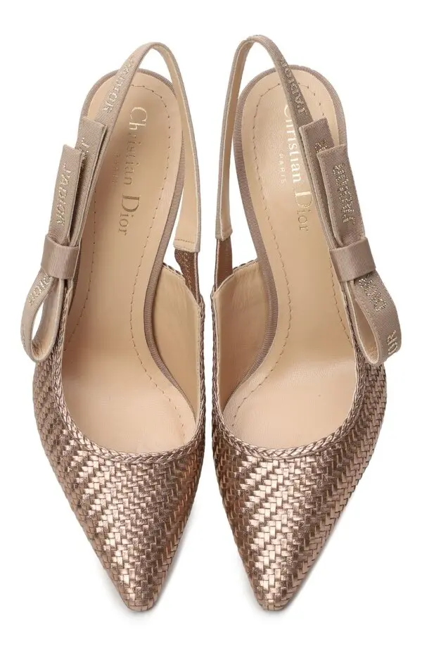 Эти изысканные туфли Dior выполнены из плетёной кожи ягнёнка с металлическим блеском, что придаёт модели роскошный и утончённый вид. Заострённый мысок подчёркивает элегантность силуэта, а изящный каблук-шпилька добавляет образу женственности. Эластичные ремешки с культовым бантом и надписью J’Adior завершают дизайн, делая пару одновременно стильной и узнаваемой. Идеальный выбор для особых случаев и вечерних выходов.