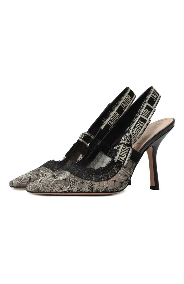 Туфли J’Adior от Dior выполнены из черного кружева с изящной вышивкой, создающей утонченный цветочный узор. Эластичный ремешок с культовой надписью J’Adior подчеркивает изысканный стиль и фирменный характер модели. Острый мыс и изящный каблук делают пару элегантным выбором для вечерних выходов и особых случаев, сочетая в себе женственность и современный шарм.
