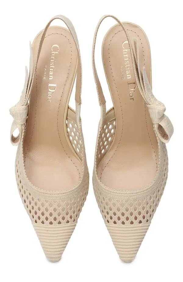 Мюли J’Adior Dior выполнены из бежевого текстиля с ажурным плетёным эффектом, создающим лёгкий и изысканный силуэт. Остроносый дизайн дополнен элегантным ремешком с культовой вышивкой J’Adior и небольшим бантом. Низкий изогнутый каблук «kitten heel» придаёт утончённость и обеспечивает комфорт при носке. Идеальная пара для создания утончённых летних и вечерних образов.