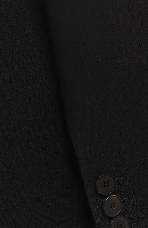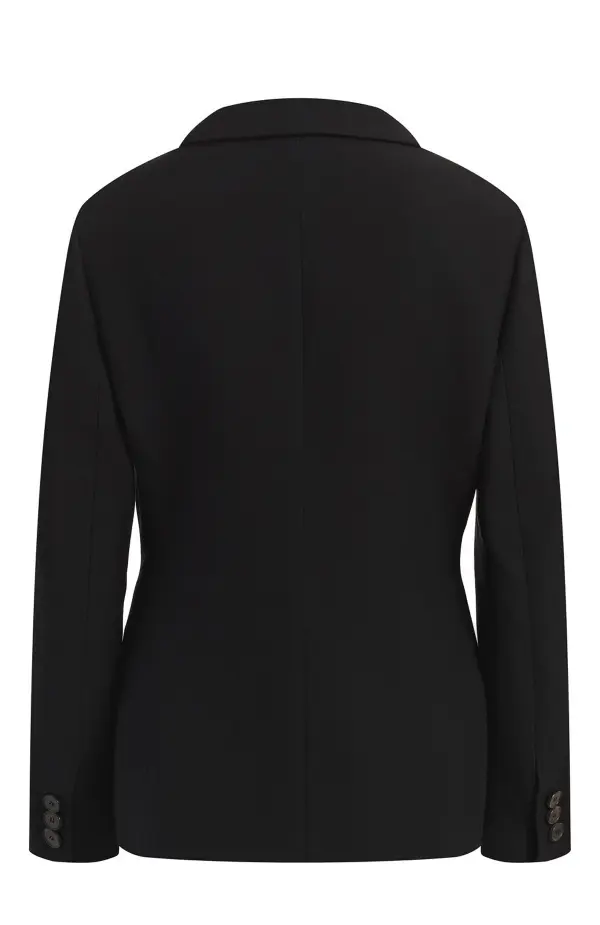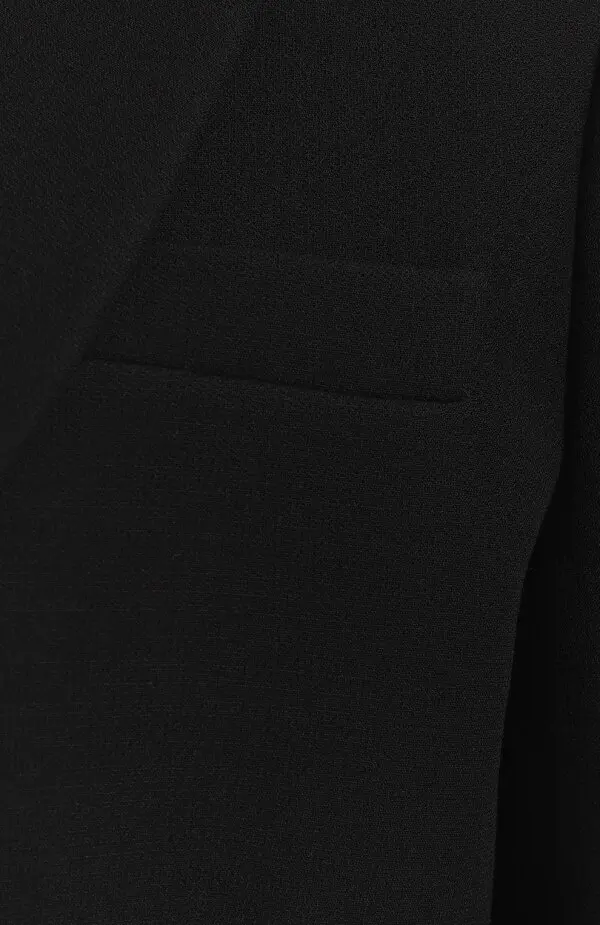 Классический чёрный жакет. Сшит из шерсти с добавлением шёлка, что делает ткань мягкой и гладкой. Прямой крой с лёгким приталиванием подчёркивает силуэт. Две пуговицы, лацканы и карманы с клапанами создают строгий и элегантный стиль.