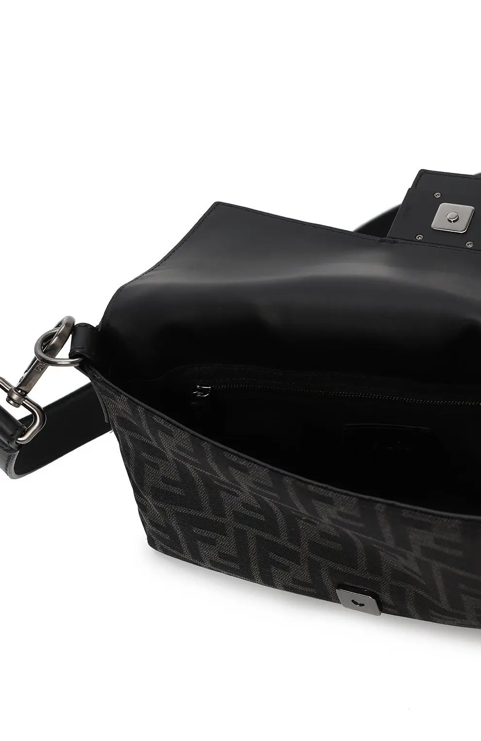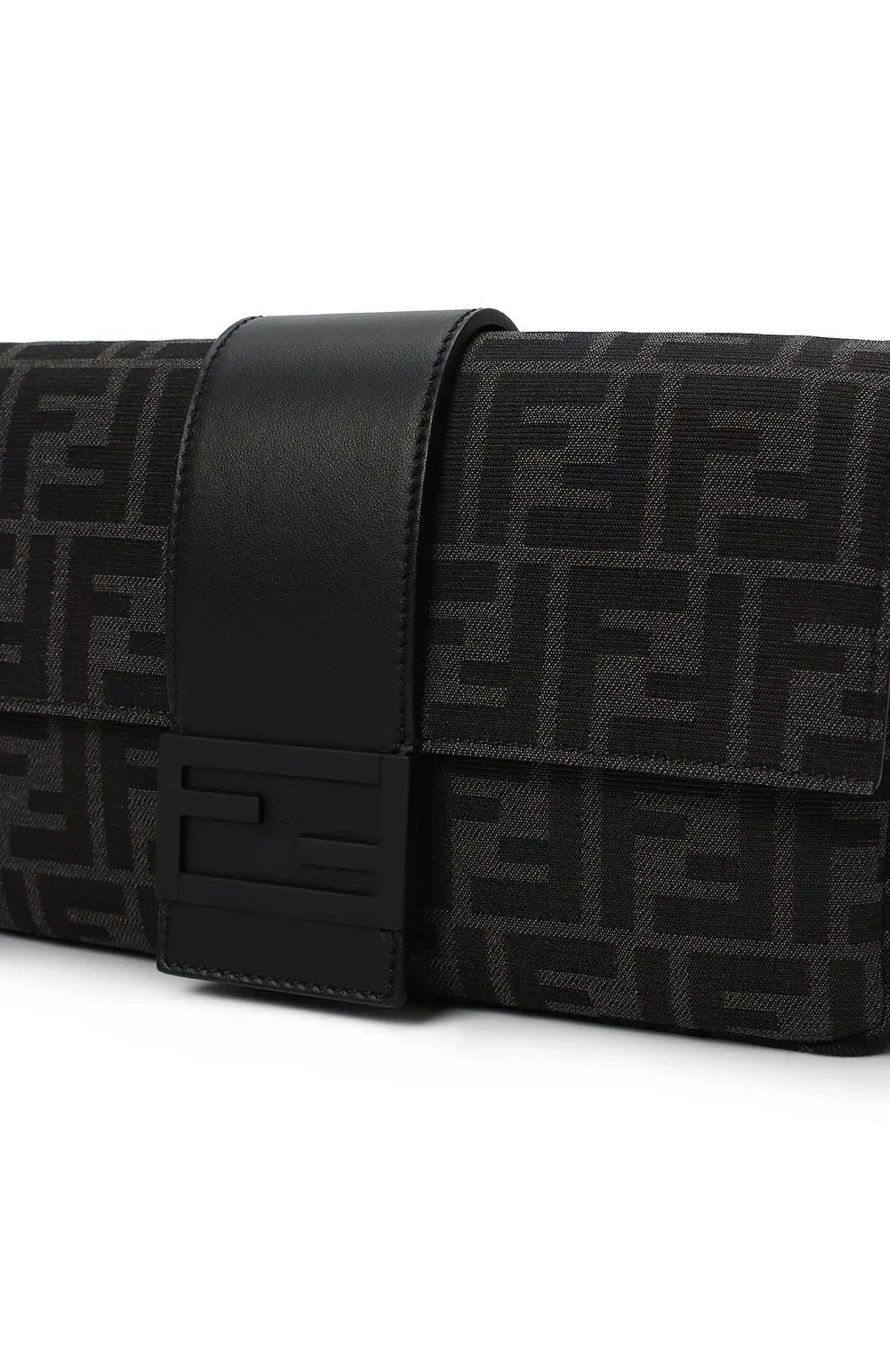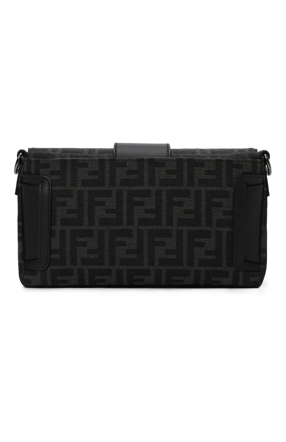 Мужская сумка Baguette от Fendi выполнена из прочного текстиля с фирменным узором FF. Модель прямоугольной формы с откидным клапаном дополнена кожаной вставкой и магнитной пряжкой в тон. Аксессуар оснащён основным отделением и внутренним карманом на молнии, что сочетает функциональность и современный минималистичный стиль.