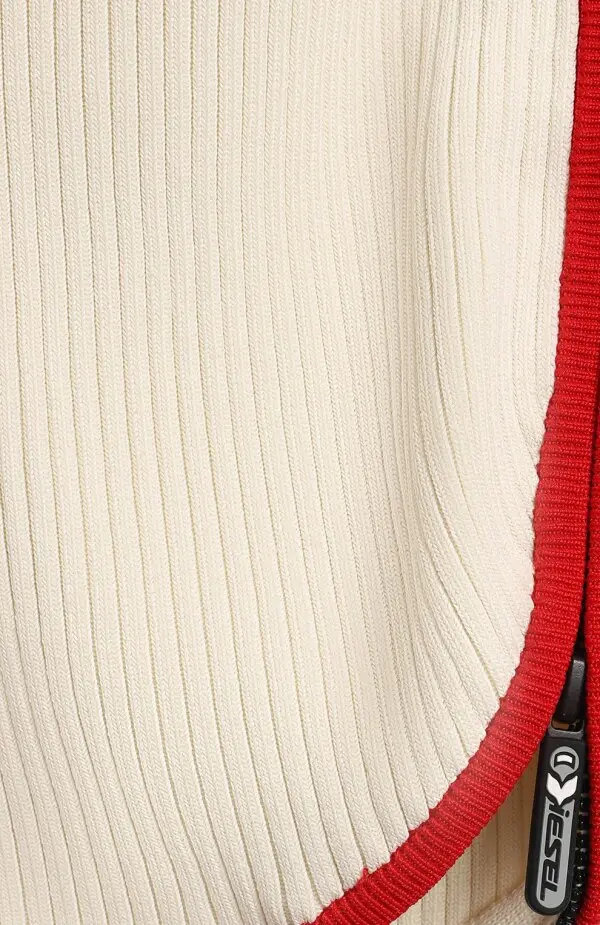 Юбку Diesel сшили из мягкой вискозы с фактурной ребристой поверхностью. Асимметричный крой дополнили контрастной отделкой ярко-красного цвета по краю и боковой молнией. Стильная деталь станет акцентом в повседневных и вечерних образах.