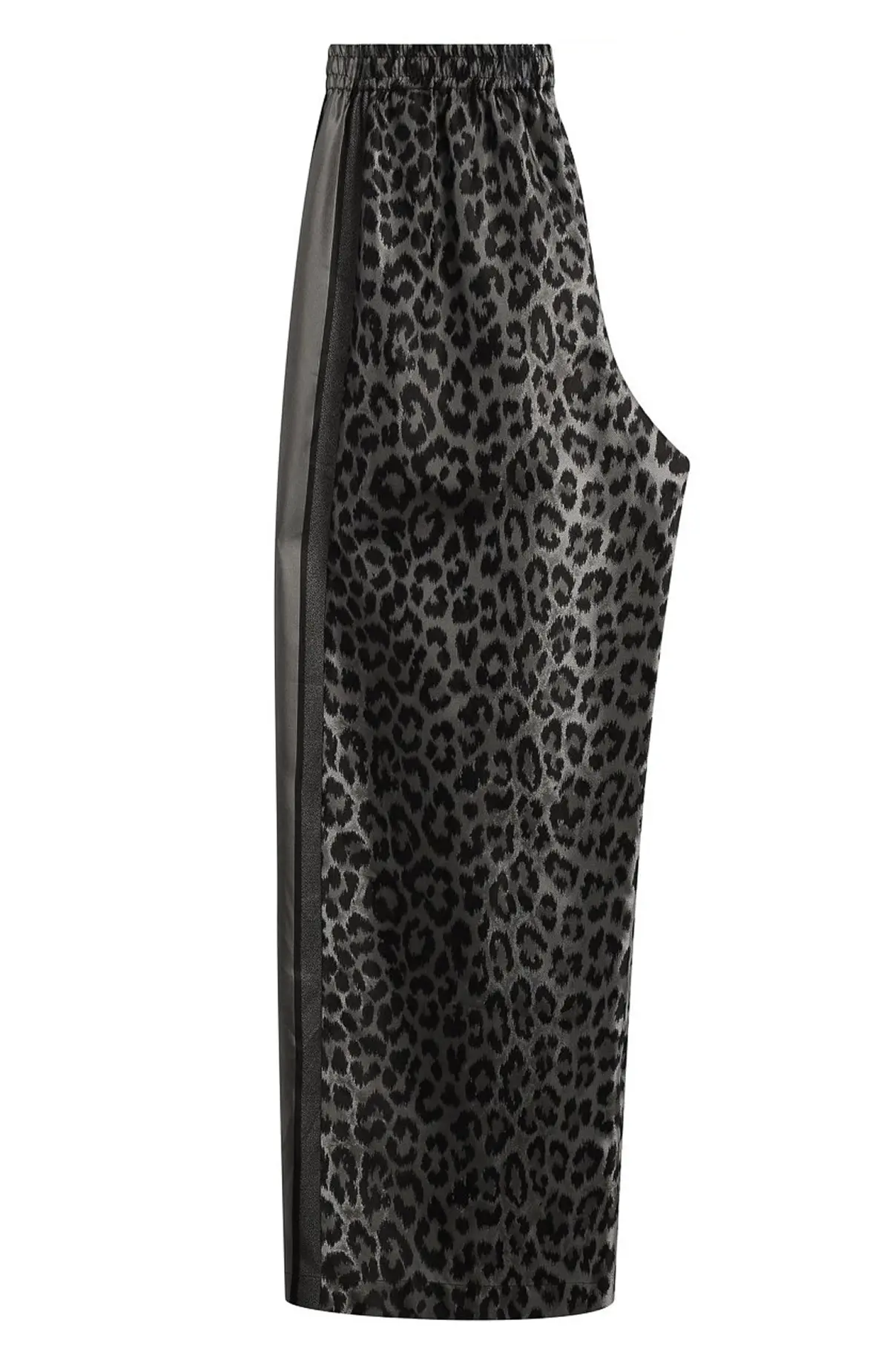 Шелковые брюки Dior с леопардовым принтом выполнены в свободном крое с широкими прямыми штанинами. Модель дополнена эластичным поясом на кулиске для комфортной посадки. Легкий блеск шелка подчеркивает изысканный характер изделия, а смелый анималистичный рисунок придает образу динамику и современный акцент.