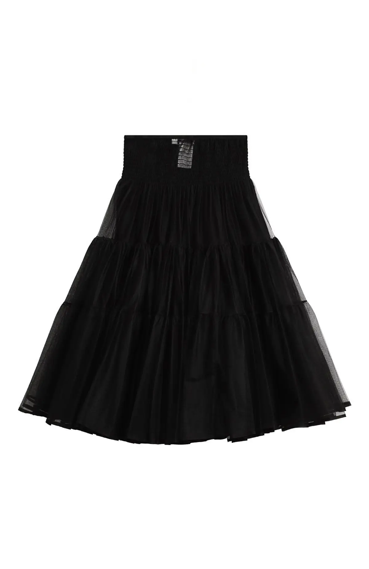 Эта чёрная юбка от Dior выполнена из лёгкого тюля и отличается многослойной, объёмной фактурой с мягкими сборками. Широкий эластичный пояс создаёт комфортную посадку и подчёркивает талию, а свободный силуэт придаёт образу воздушность и элегантность. Идеальный выбор для создания как романтичного, так и вечернего ансамбля.