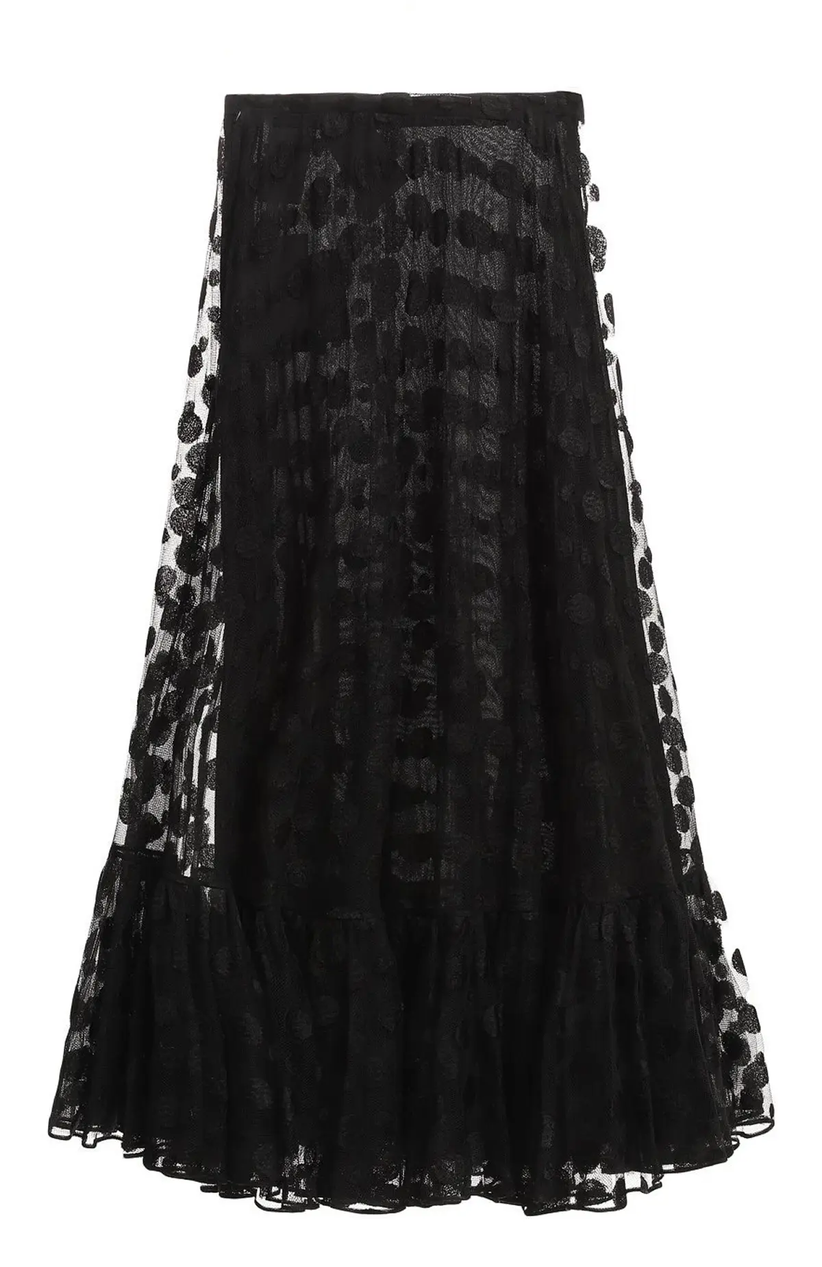 Чёрная юбка от Dior выполнена из лёгкой прозрачной ткани с узором в горох, что придаёт образу игривость и женственность. Свободный крой и мягкие оборки по подолу создают романтичное движение при ходьбе, а миди-длина делает модель универсальной для сочетаний как с повседневными, так и с более элегантными комплектами.