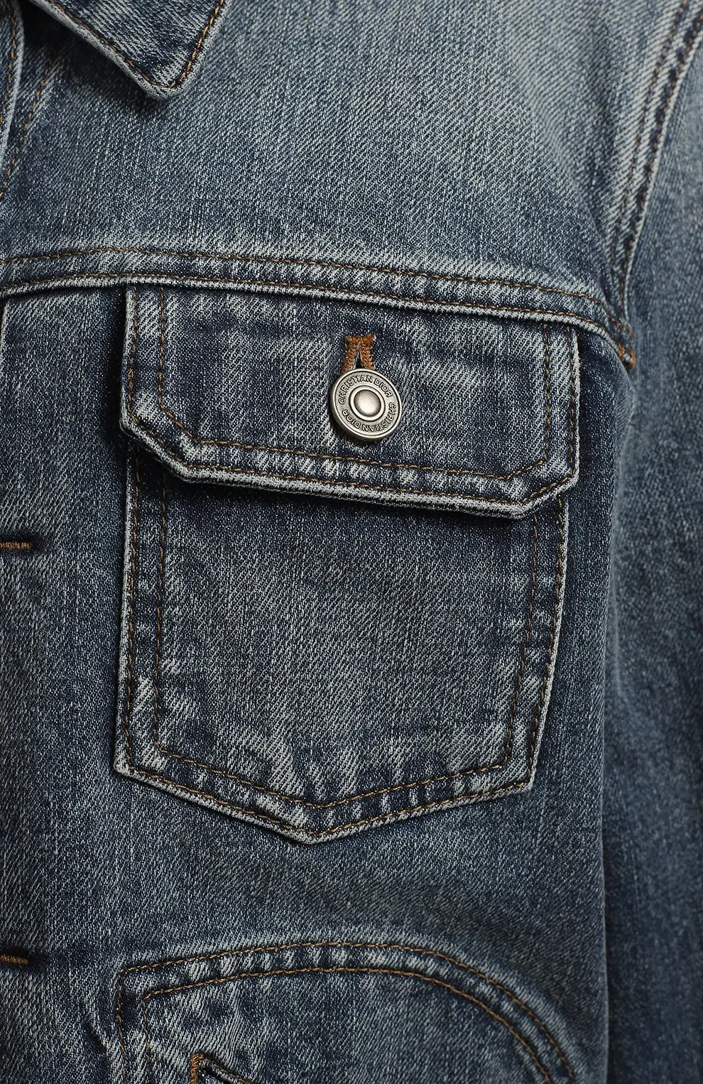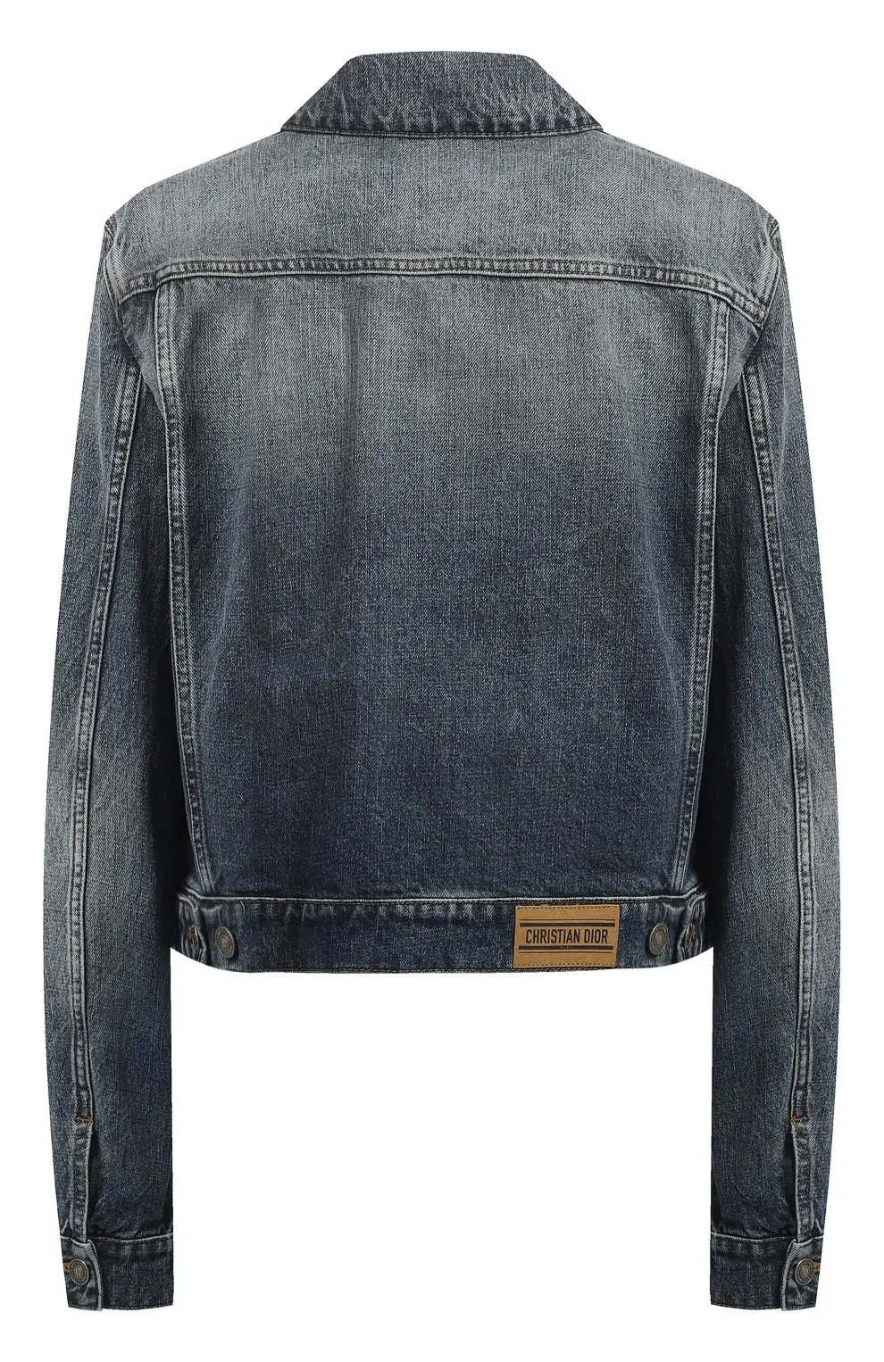 Джинсовая куртка Dior — классическая модель в темно-синем дениме с эффектом легкого винтажного потертости. Изделие выполнено в традиционном прямом крое, дополнено отложным воротником, застежкой на металлические пуговицы и четырьмя карманами спереди — двумя накладными на груди и двумя прорезными по бокам. Универсальный дизайн делает куртку стильной основой для повседневных и городских образов.