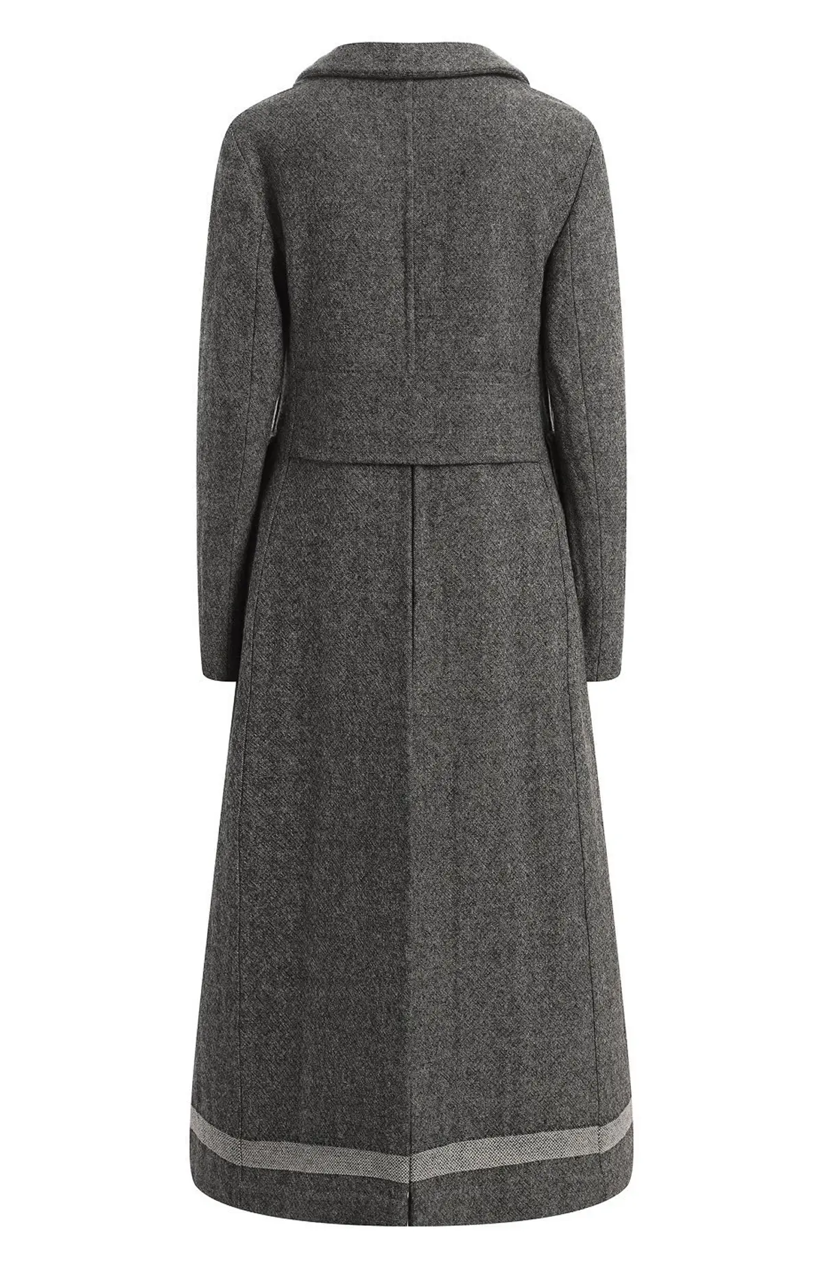Серое шерстяное пальто Dior с двубортной застёжкой отличается элегантным приталенным силуэтом и длиной макси. Модель украшена широкими лацканами и карманами с клапанами, а по краю подола и боковым швам проходит контрастная отделка с фирменным логотипом Christian Dior, подчеркивающая утончённый стиль. Пальто идеально сочетает классику и современные акценты, создавая благородный образ.