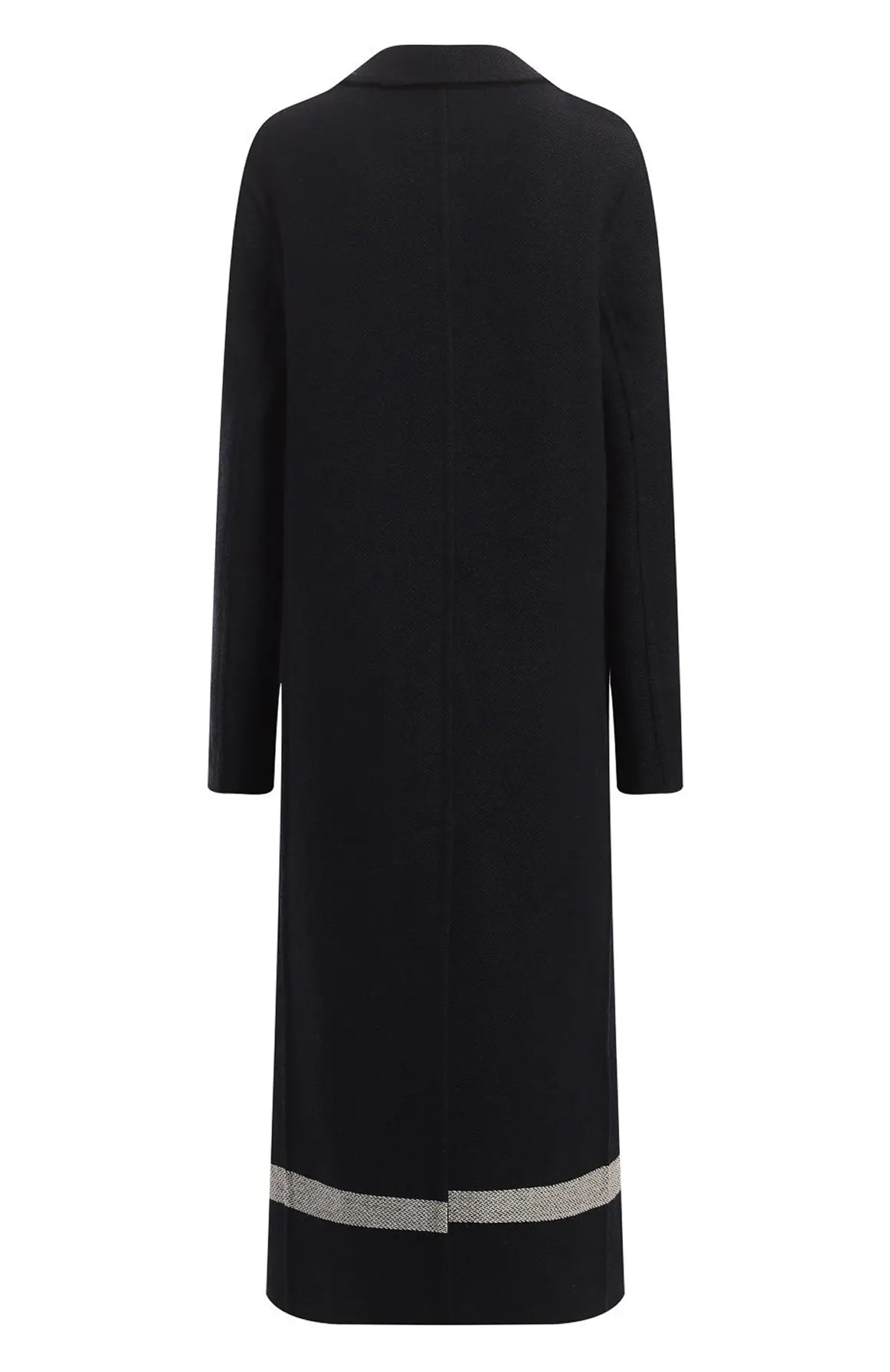 Шерстяное пальто от Dior выполнено в элегантном чёрном цвете и отличается лаконичным удлинённым силуэтом. Модель с классическим отложным воротником и застёжкой на три пуговицы дополнена прорезными карманами с клапанами. Особым акцентом служит контрастная вставка у подола с фирменным логотипом Christian Dior, придающая образу современную графичность. Пальто гармонично сочетает традиционную классику с модными деталями.