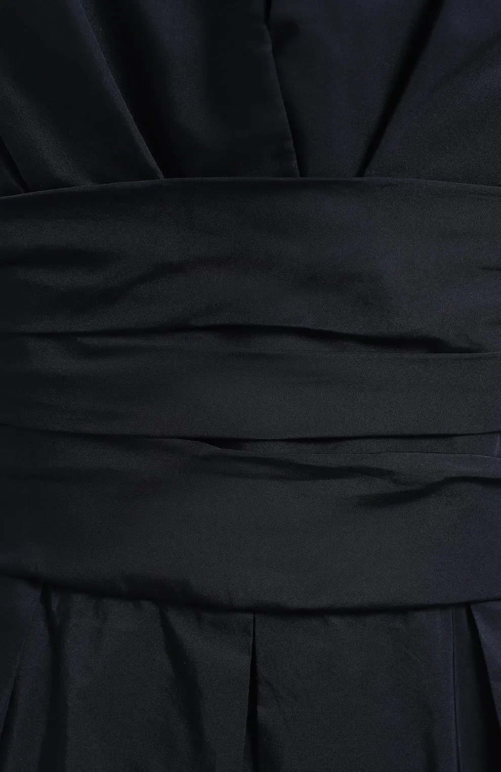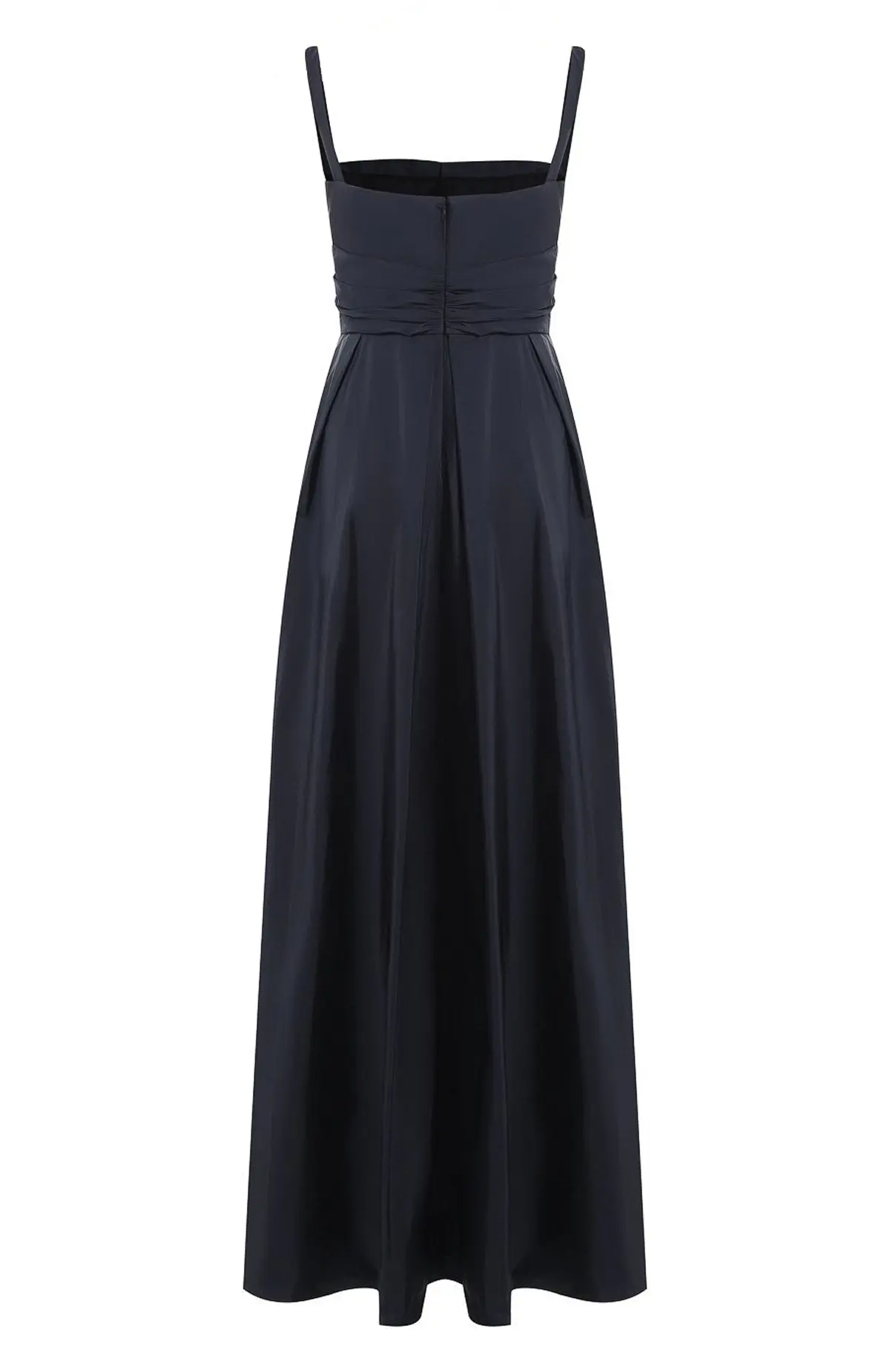 Элегантное вечернее платье Dior из струящегося тёмного атласа. Модель с широкими бретелями и глубоким вырезом подчёркивает линию декольте, а драпированная вставка на талии создаёт женственный силуэт. Длинная расклёшенная юбка придаёт образу утончённость и торжественный характер.