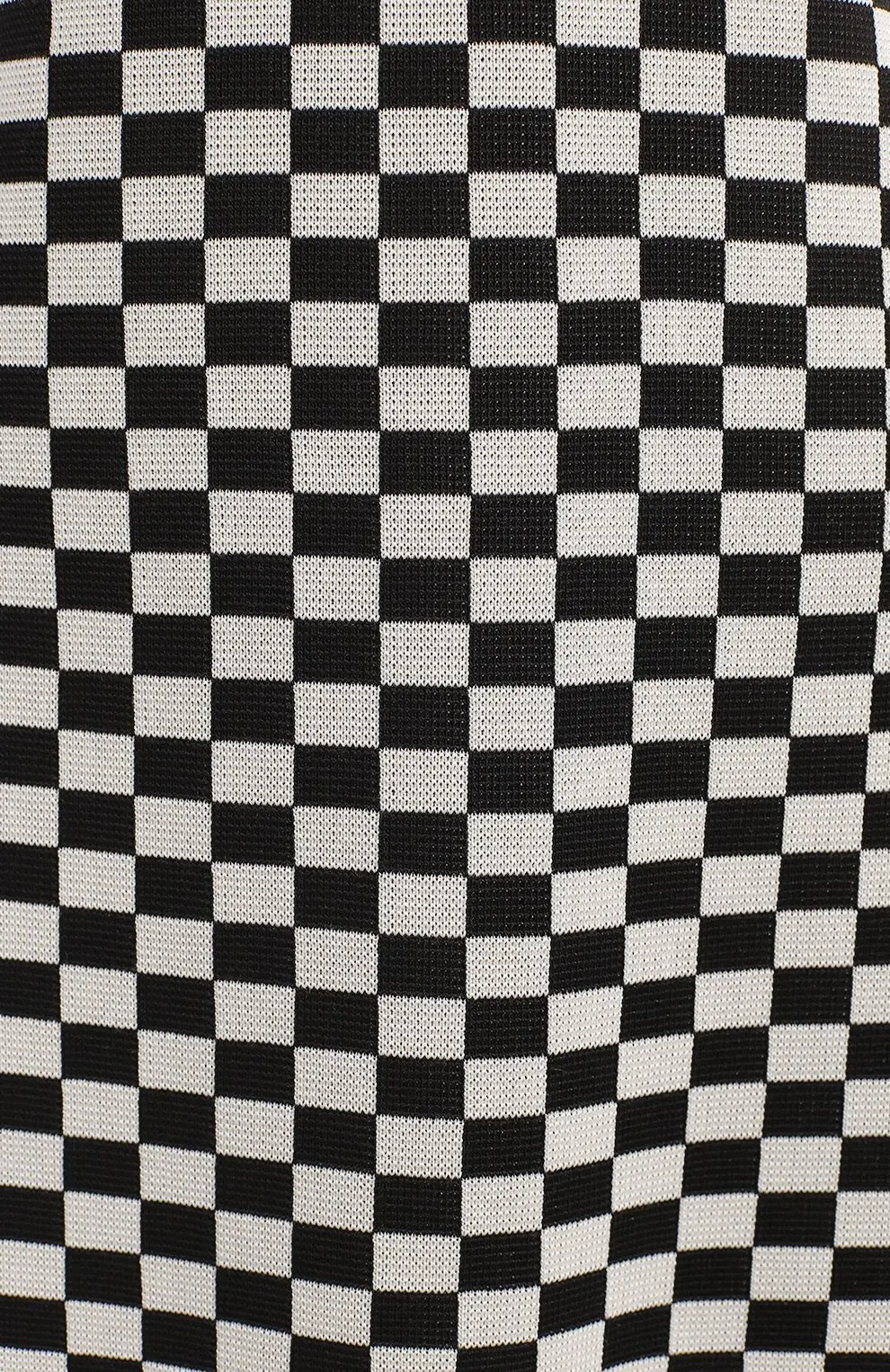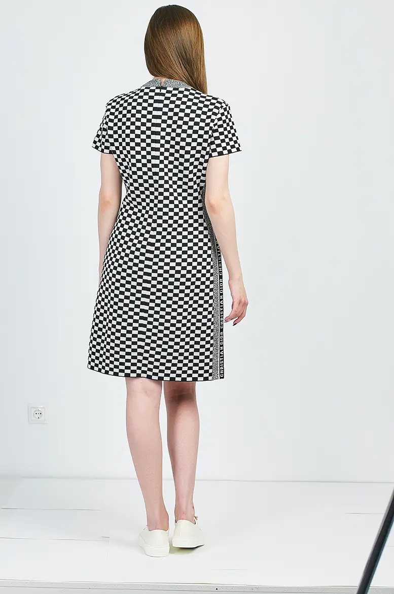 Платье Dior из шелка и хлопка. Модель приталенного кроя с короткими рукавами выполнена в графичном черно-белом клетчатом узоре, украшено фирменной отделкой по боковым швам.
