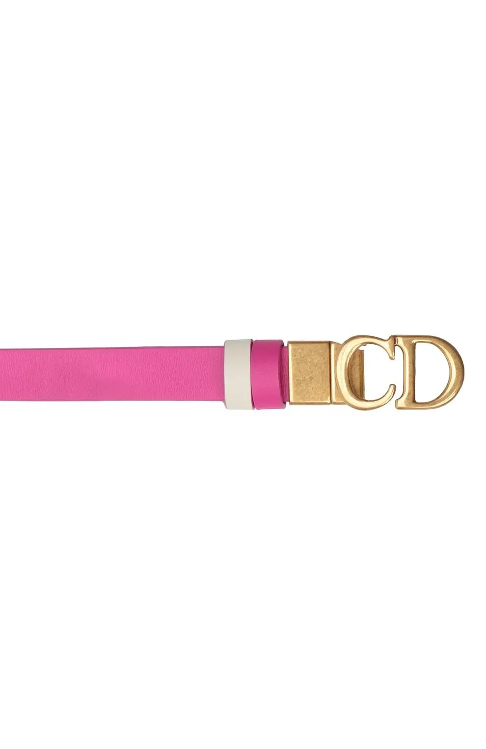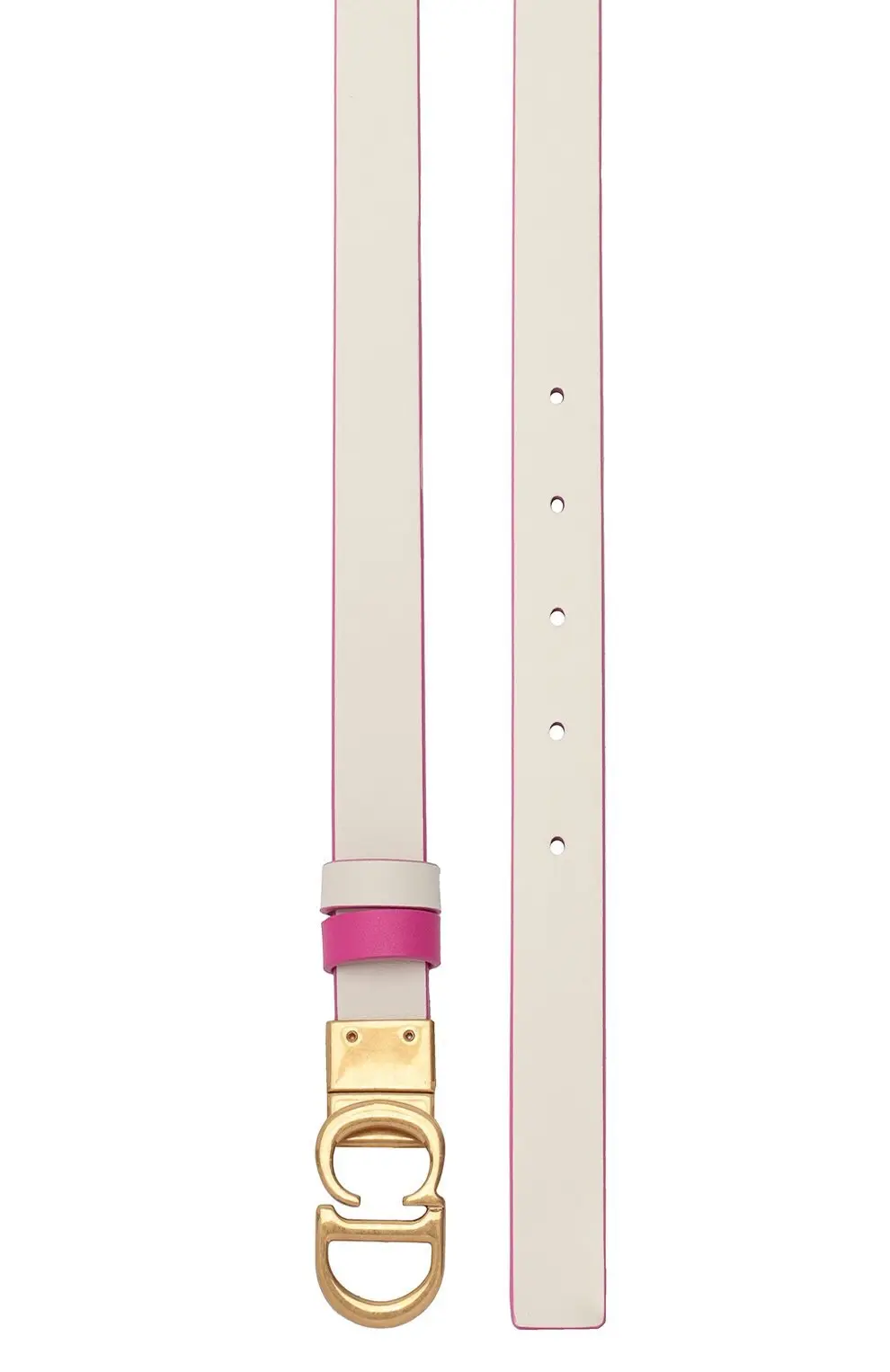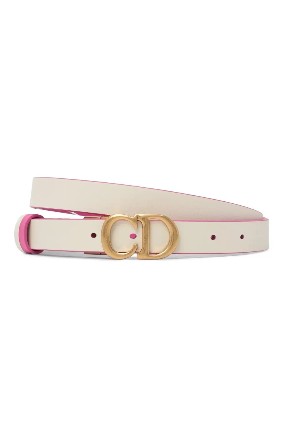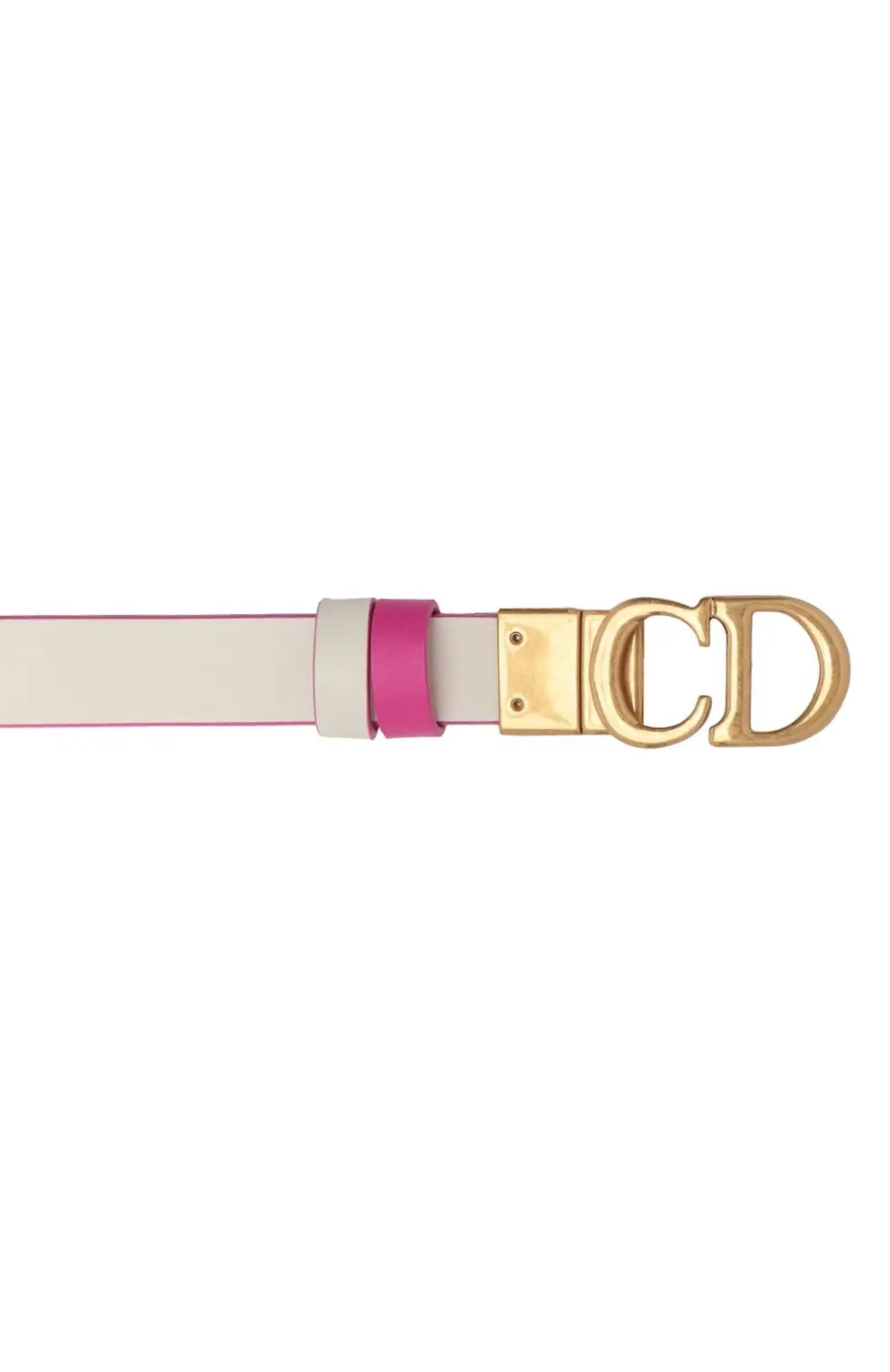 Двусторонний ремень Dior выполнен из гладкой кожи и украшен фирменной пряжкой CD в матовом золотистом оттенке. Сочетание ярко-розовой и кремовой сторон позволяет варьировать стиль — от выразительного акцента до элегантной нейтральности. Изысканный аксессуар, который подчеркнёт талию и добавит утончённости любому образу.