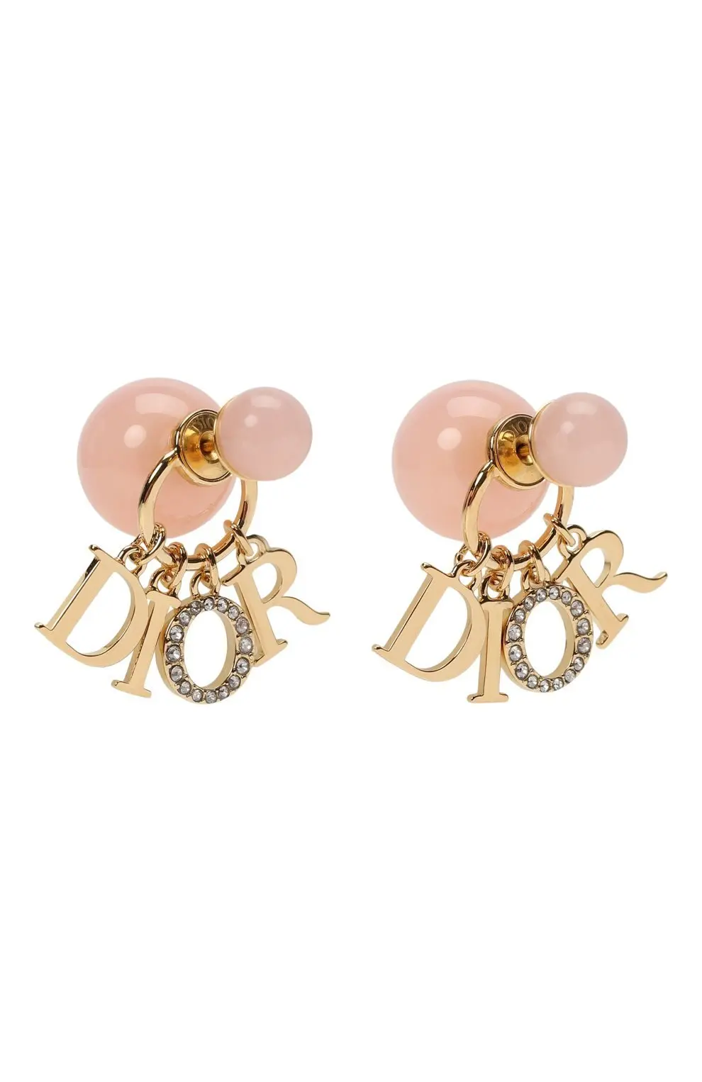 Серьги Dior Tribales оформили крупными розовыми бусинами и подвесками в виде золотистых букв логотипа бренда. Буква «O» инкрустирована кристаллами, что добавляет изделию блеска и акцентного шарма. Эффектный аксессуар подчеркнет женственность и станет ярким дополнением к вечерним и повседневным образам.
