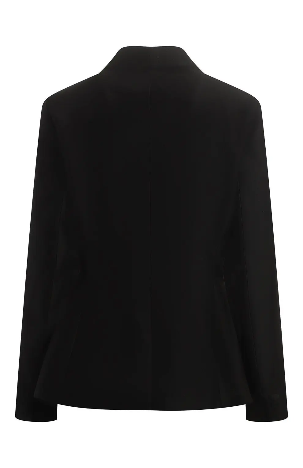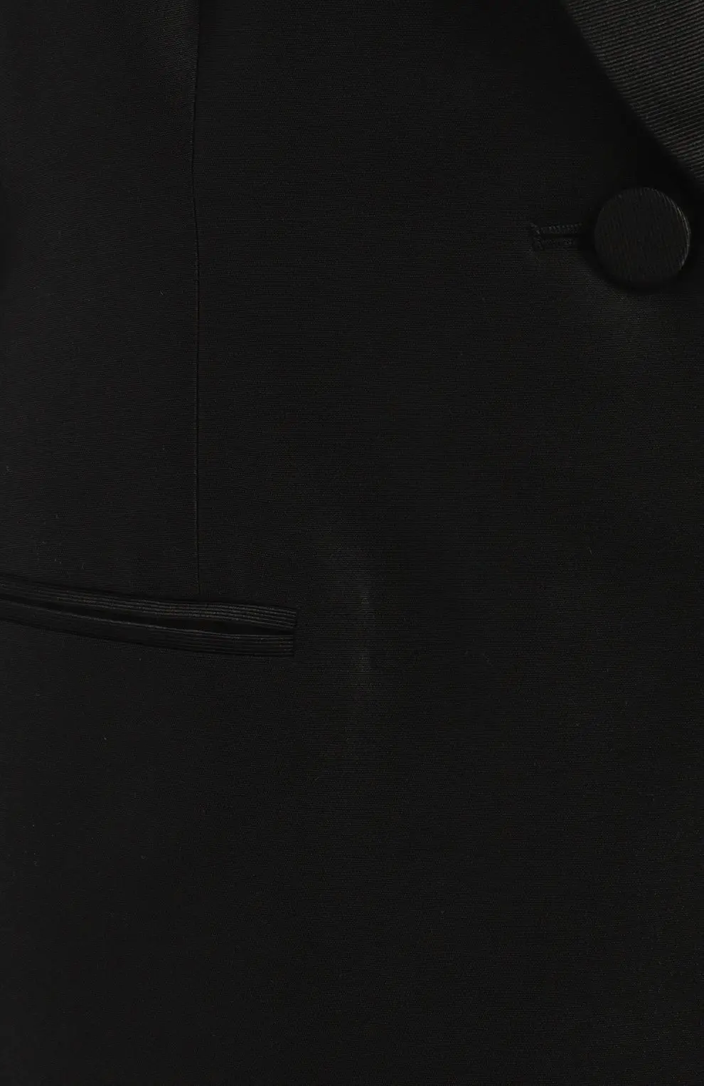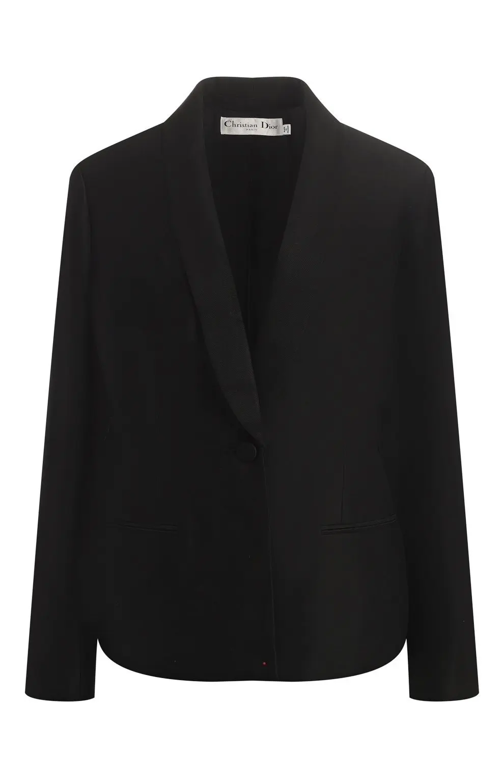 Жакет от Christian Dior выполнен из шерсти с добавлением шелка в классическом чёрном цвете. Модель прямого кроя с шальским воротником и застёжкой на одну пуговицу отличается лаконичным силуэтом. Минималистичный дизайн делает жакет универсальной базой для элегантных образов.