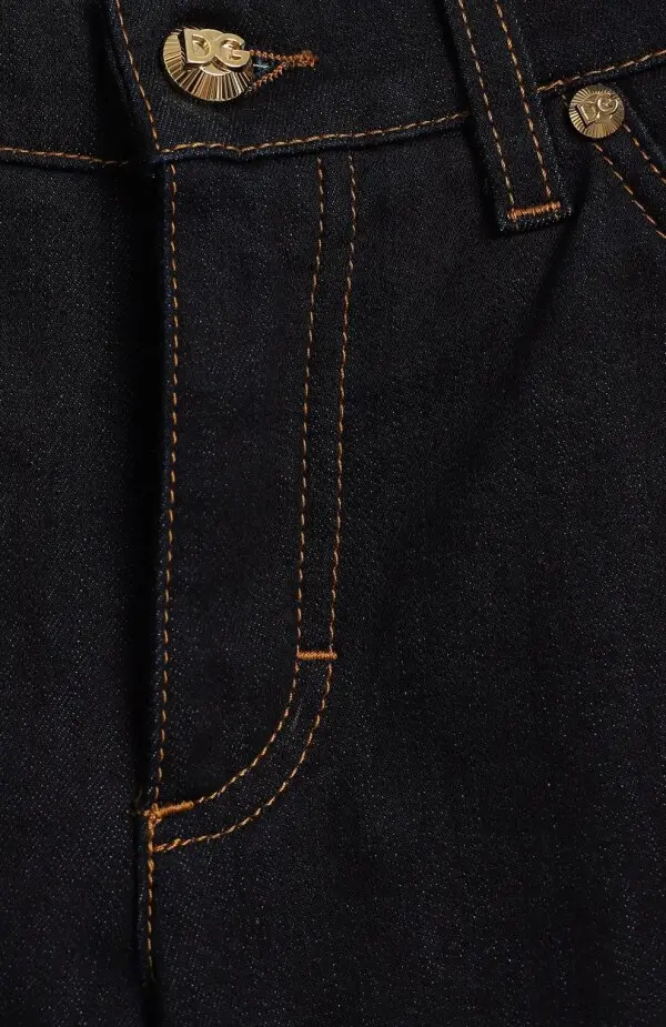 Джинсы Dolce & Gabbana из плотного денима глубокого синего цвета. Классический прямой крой с пятью карманами, контрастной прострочкой и фирменной фурнитурой бренда. Универсальная модель, подходящая как для повседневных, так и для более стильных образов.