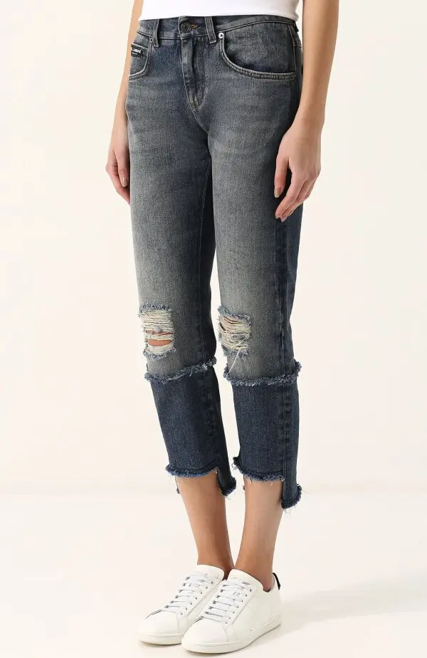Джинсы выполнены из плотного денима тёмно-синего оттенка с выраженной выбеленностью. Крупные потертости и разрывы на коленях, а также контрастные вставки по низу создают эффект подчёркнутой гранжевой состаренности. Свободный прямой крой с укороченной длиной обеспечивает комфортное прилегание и добавляет образу расслабленную актуальность.