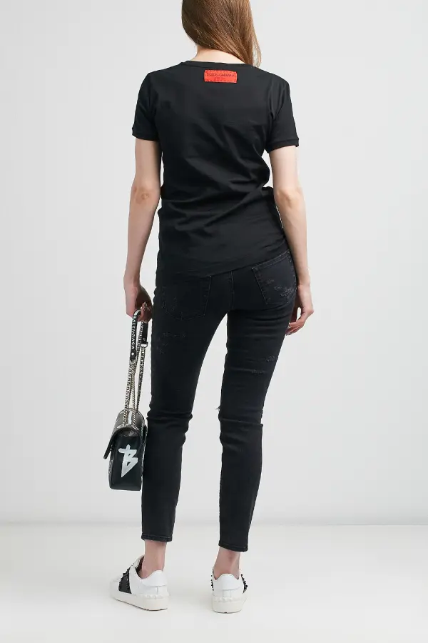 Джинсы выполнены из плотного чёрного денима с тонкими потертостями и аккуратными разрывами по штанинам. Яркая нашивка в форме сердца с короной добавляет модели выразительный акцент. Узкий крой обеспечивает комфортное прилегание и подчеркивает современный силуэт.