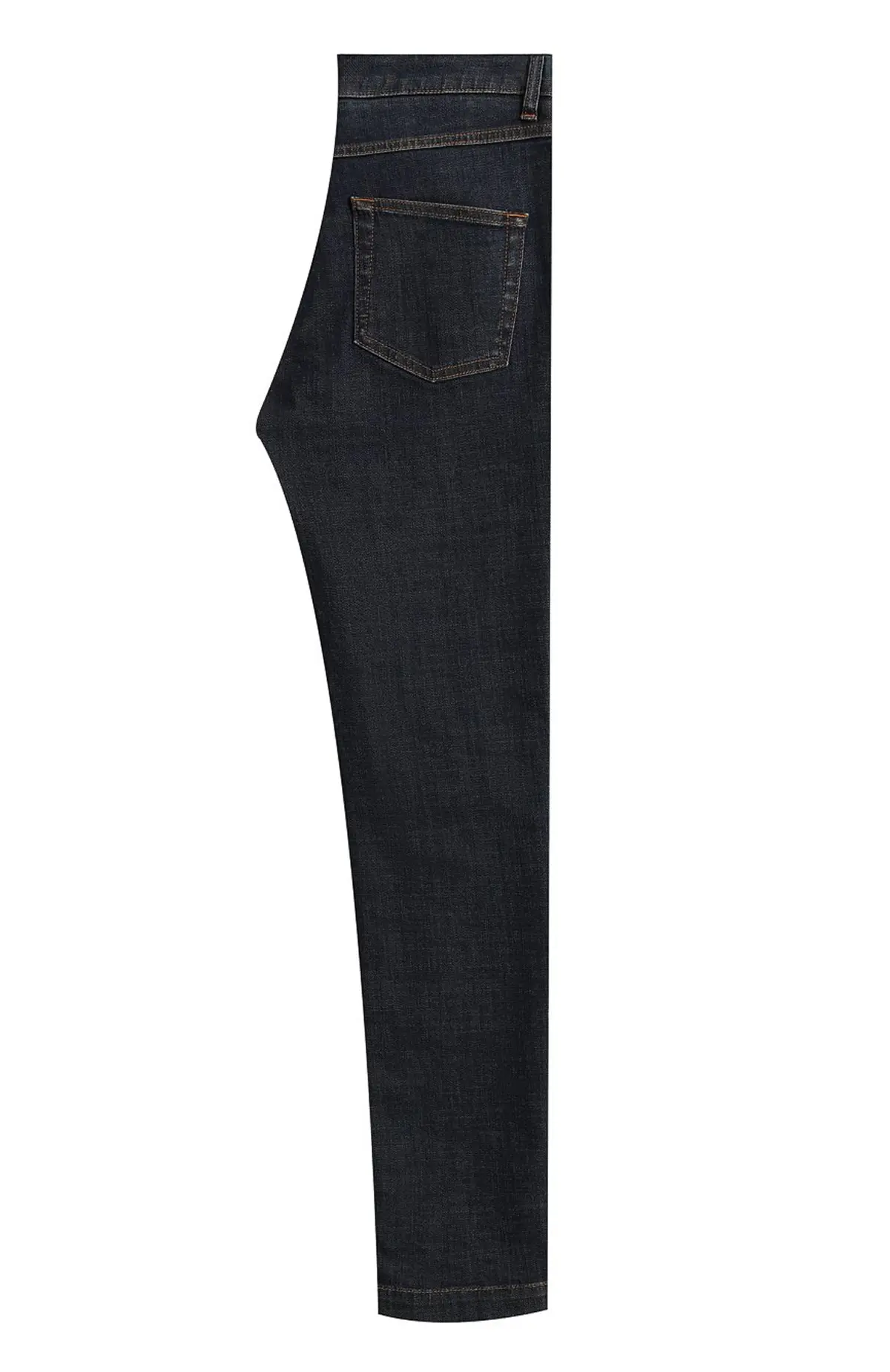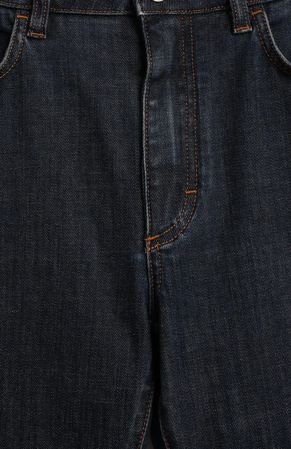 Джинсы выполнены из плотного денима глубокого тёмно-синего оттенка с лёгкой фактурной выбеленностью. Лаконичный дизайн без потертостей создаёт чистый, универсальный силуэт. Прямой зауженный крой обеспечивает комфортное прилегание и легко сочетается как с повседневными, так и с более формальными комплектами.