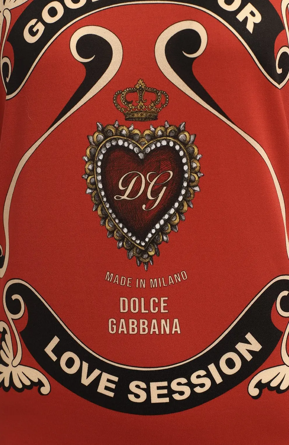 Хлопковая футболка Dolce&Gabbana представлена в насыщенном красном цвете с чёрной окантовкой горловины. Модель украшена крупным декоративным принтом в стиле барокко: в центре расположен сердце с монограммой DG и короной, окружённое узорами и надписями «GOOD DAY FOR LOVE SESSION». Яркий дизайн подчёркивает фирменный стиль бренда и делает изделие выразительным акцентом повседневного образа.