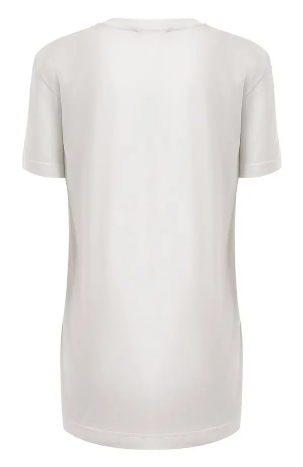 Футболка выполнена из мягкого хлопкового джерси плотного белого цвета. Яркий мультиколорный принт в стиле граффити с надписями и сердцами придаёт модели игривое настроение. Прямой крой с классическим круглым вырезом обеспечивает комфортное прилегание и легко вписывается в повседневные образы.