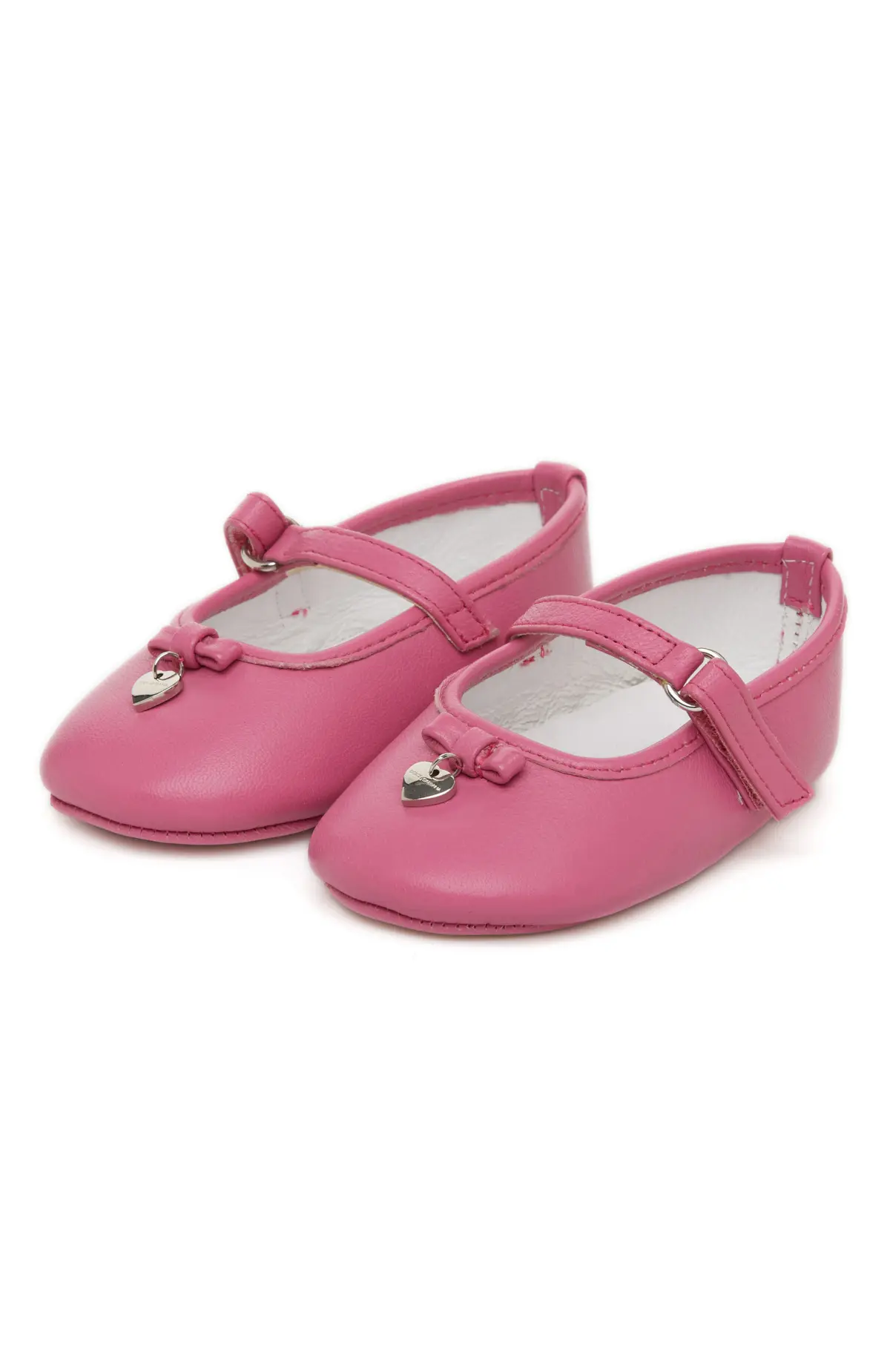 Пинетки выполнены из мягкой розовой кожи с бархатистой подкладкой, обеспечивающей деликатное прилегание. Ремешок Mary Jane на велкро фиксирует ножку, миниатюрный подвес-сердце добавляет аккуратный акцент. Гибкая тонкая подошва подходит для первых движений и комфортна в повседневной носке.