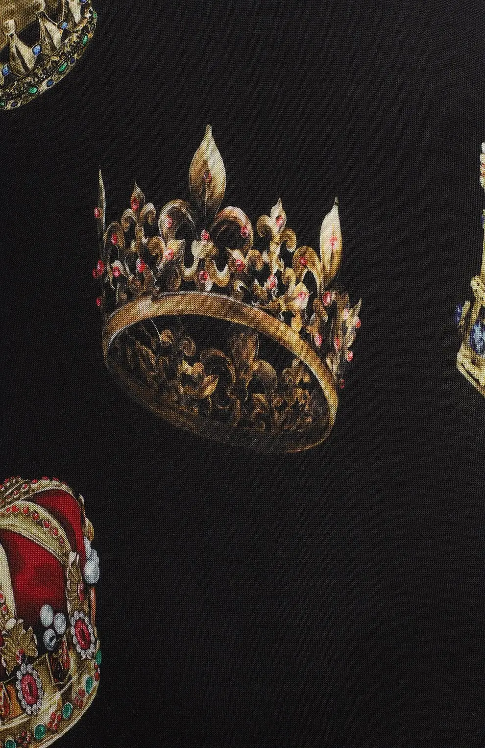 Шелковый джемпер Dolce & Gabbana украшен фирменным принтом с коронами, символизирующим изысканность и королевский стиль бренда. Легкая, гладкая ткань из натурального шелка обеспечивает комфорт и роскошное ощущение на коже. Контрастные бордовые и белые полосы на манжетах и поясе придают изделию современный спортивный акцент.