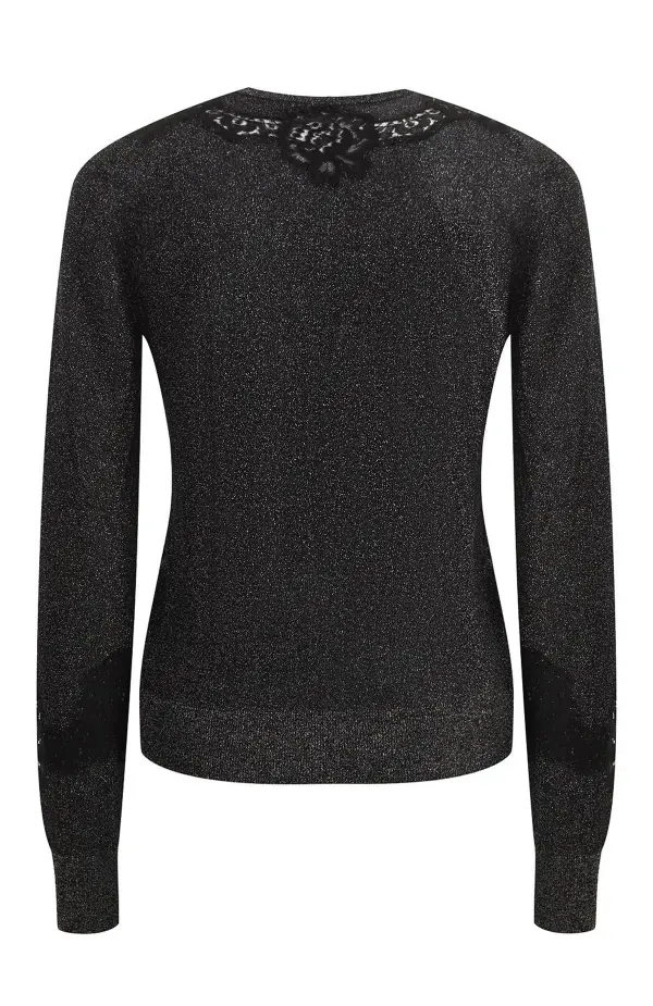 Пуловер выполнен из мягкого смесового трикотажа на основе вискозы и хлопка с деликатным мерцающим эффектом. Полупрозрачные кружевные вставки с цветочным рисунком визуально моделируют силуэт и добавляют образу вечернюю нотку. Приталенный крой обеспечивает комфортное прилегание и легко сочетается как с юбками, так и с лаконичными брюками.
