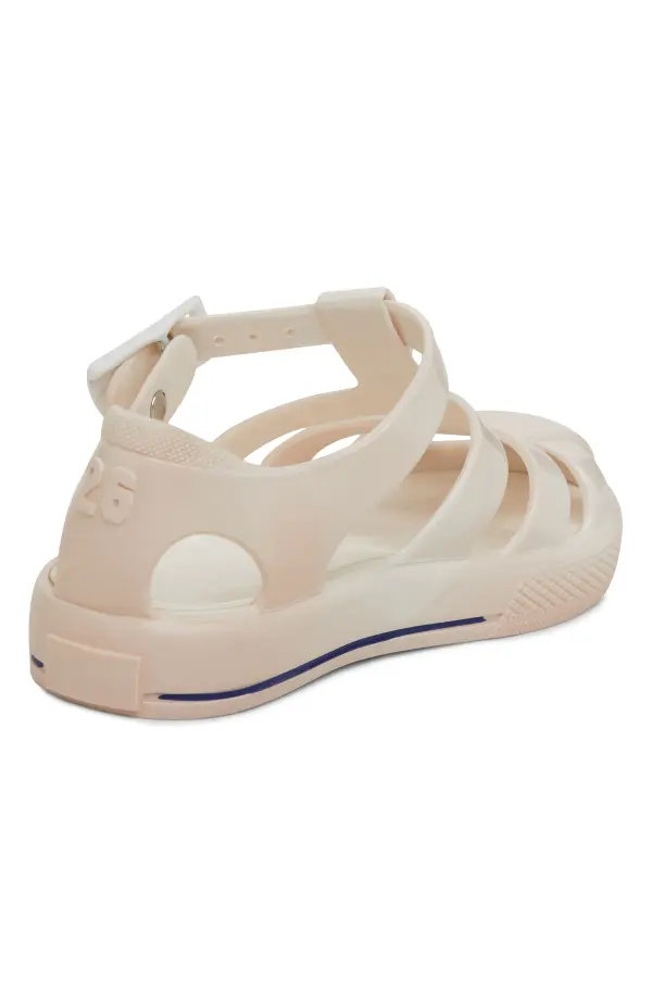 Лёгкие детские сандалии из мягкого глянцевого TPU: закрытый мыс, боковые прорези и регулируемая пряжка обеспечивают комфортную посадку. Быстро сохнут и не боятся воды, а амортизирующая подошва с протектором дарит устойчивость; на борту — аккуратный фирменный акцент. Нюдовый оттенок легко сочетается с хлопковыми сарафанами, шортами и пляжными комплектами.