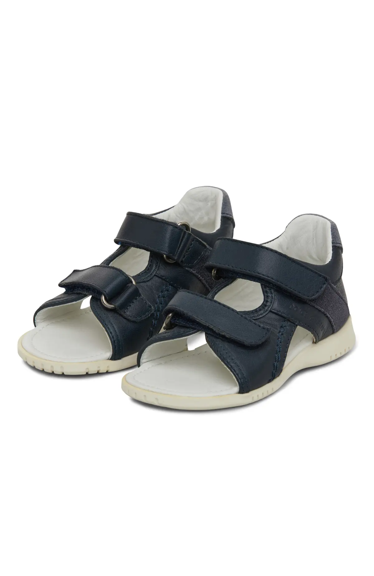 Минималистичные сандалии из мягкой кожи насыщенного синего оттенка. Два ремешка на велкро и поддерживающий задник надежно фиксируют стопу, перфорация и вырезы обеспечивают вентиляцию. Легкая гибкая подошва и мягкая анатомическая стелька дарят комфорт на весь день. Отличный вариант на каждый день к шортам, хлопковым брюкам и поло.