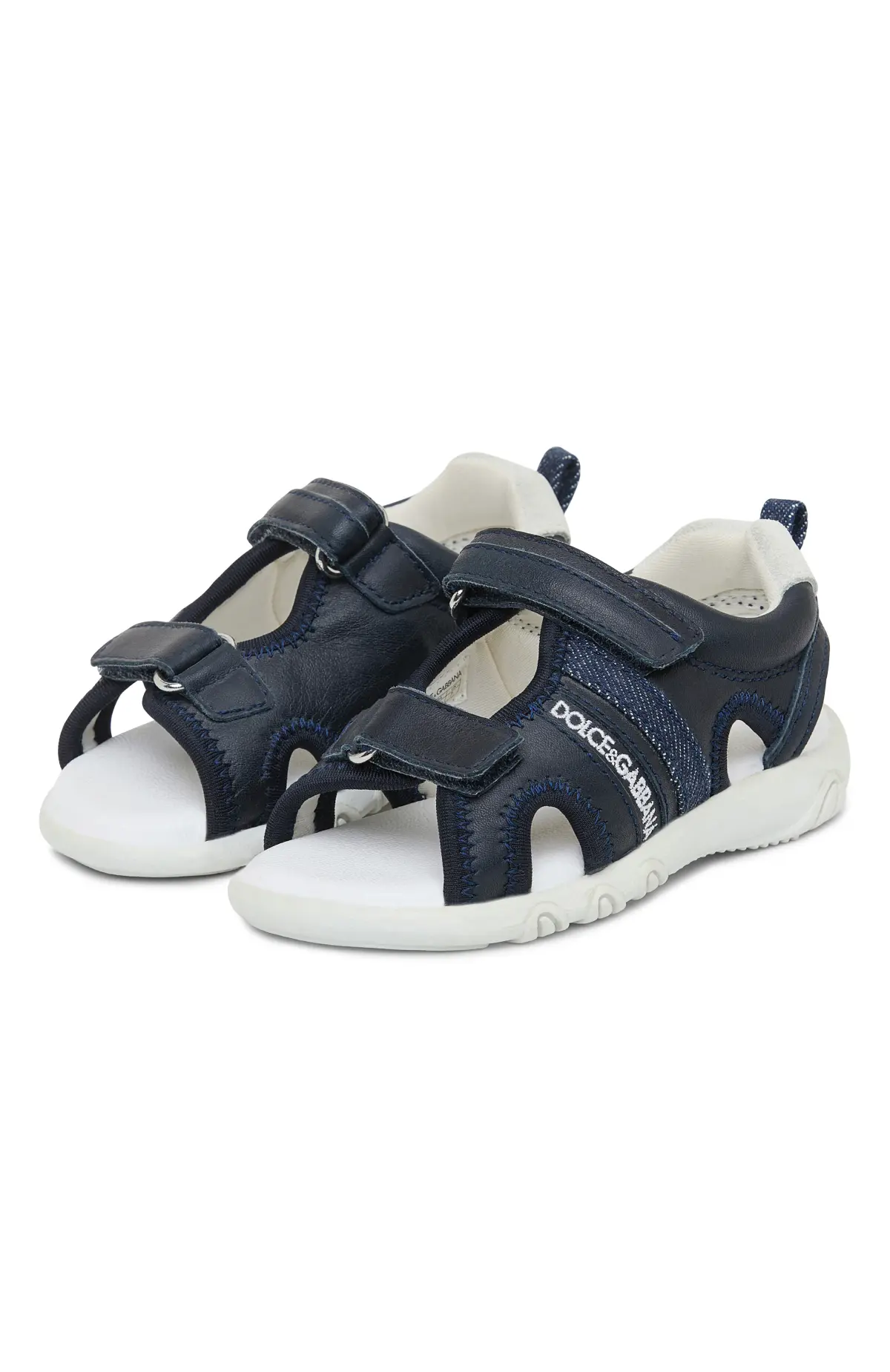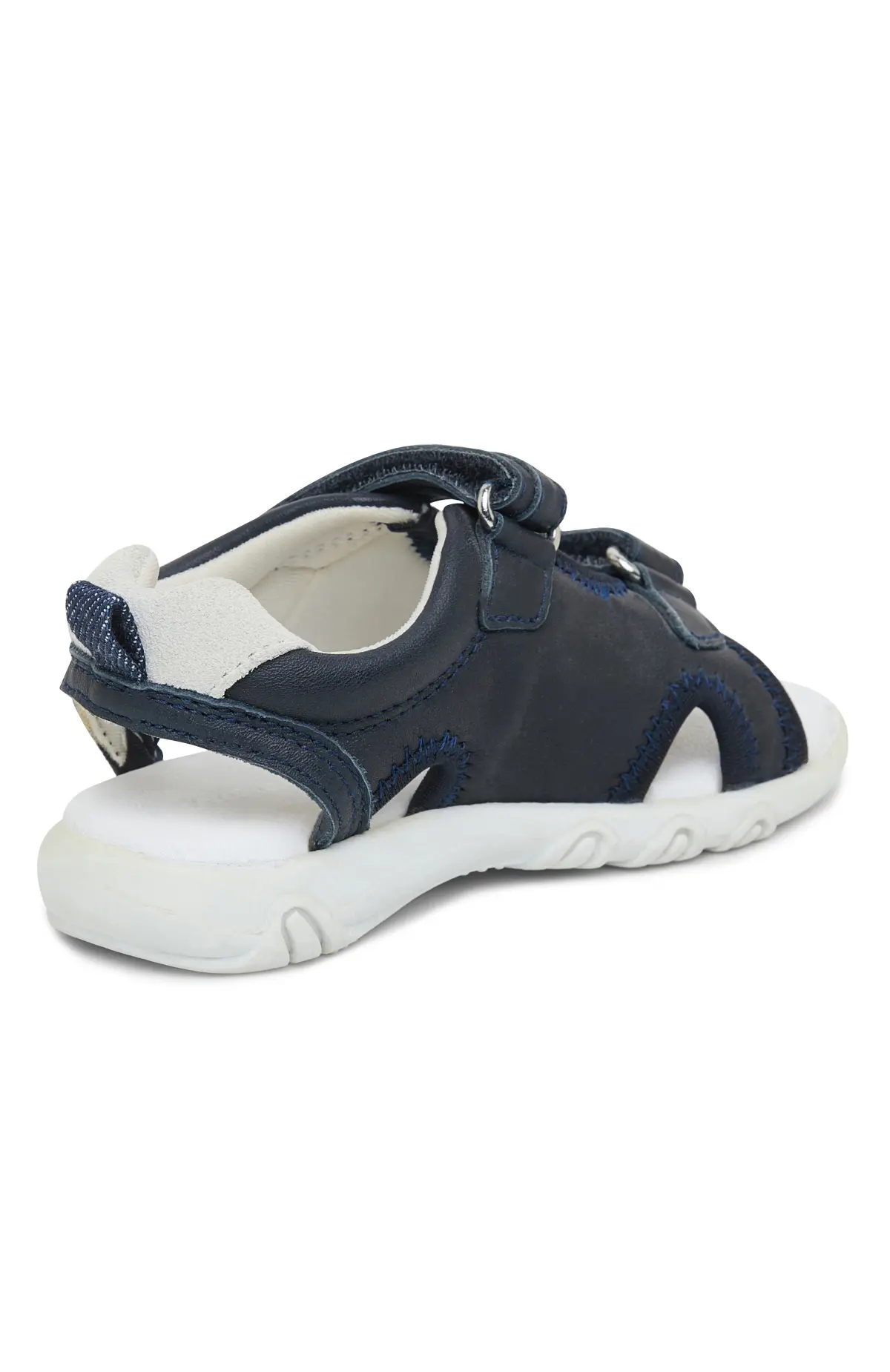 Сандалии выполнены из мягкой тёмно-синей кожи с перфорацией для вентиляции. Регулируемые ремешки на велкро фиксируют стопу и обеспечивают комфортное прилегание. Лёгкая амортизирующая подошва с рельефным протектором смягчает шаг и подходит для активной повседневной носки.