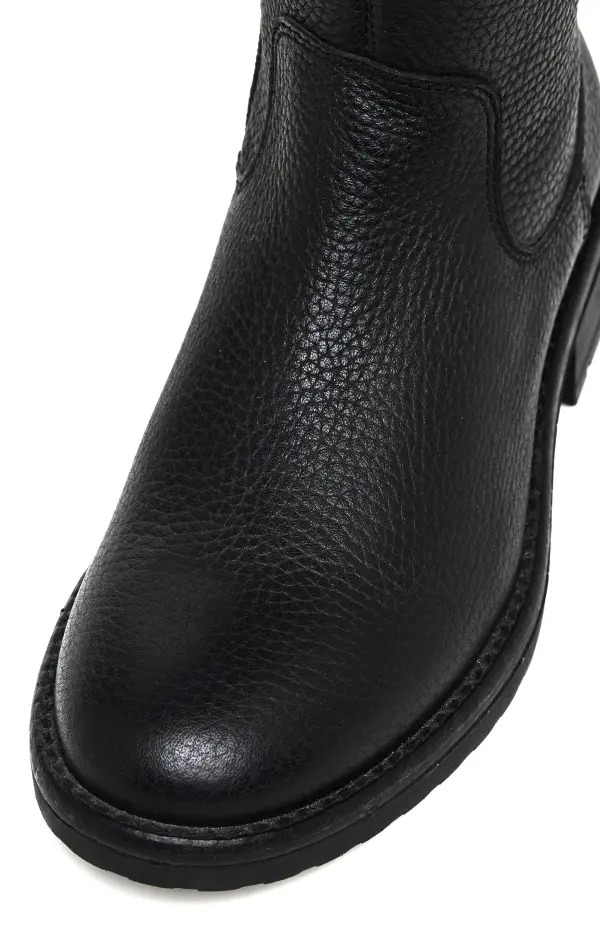 Сапоги выполнены из плотной зернёной кожи в глубоком чёрном оттенке. Боковая молния и ремешок с пряжкой у голенища упрощают посадку и подчёркивают лаконичный силуэт. Низкий устойчивый каблук и рифлёная подошва обеспечивают уверенное сцепление и комфортное прилегание на каждый день.