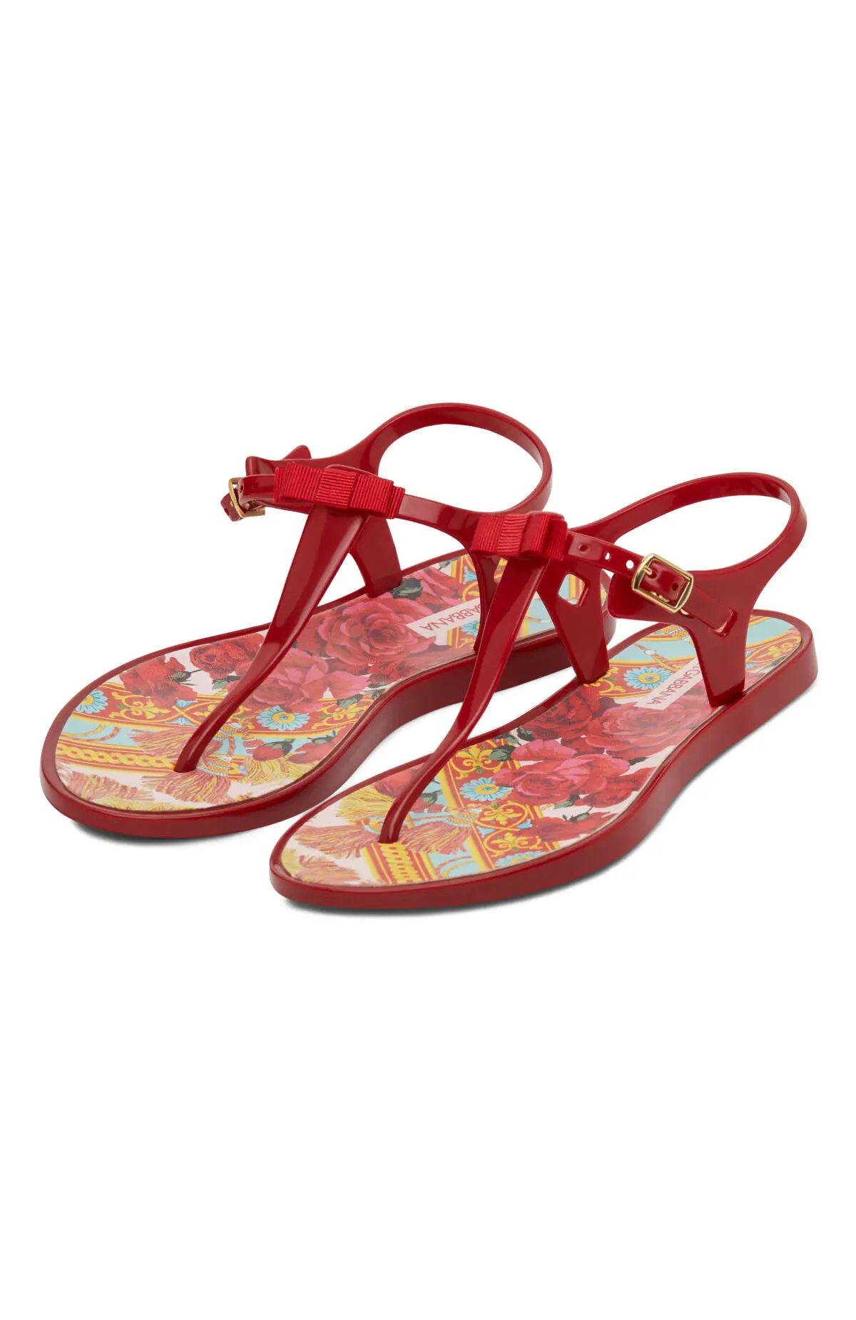 Лёгкие сланцы из гибкого PVC с Т-образным ремешком и мини-бантом, фиксируются регулируемой золотистой пряжкой на щиколотке. Стелька украшена ярким фирменным цветочно-сицилийским принтом, подошва с противоскользящим рельефом обеспечивает комфорт на весь день. Идеальны для отдыха у воды и летних образов с платьями, шортами и купальниками.