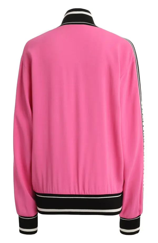 Толстовка выполнена из мягкого трикотажа на основе вискозы насыщенного розового оттенка. Контрастные трикотажные манжеты, воротник-стойка и нижняя резинка в чёрно-белой гамме подчёркивают спортивный характер модели. Застёжка на молнию и прорезные карманы обеспечивают комфортное использование в повседневных образах.