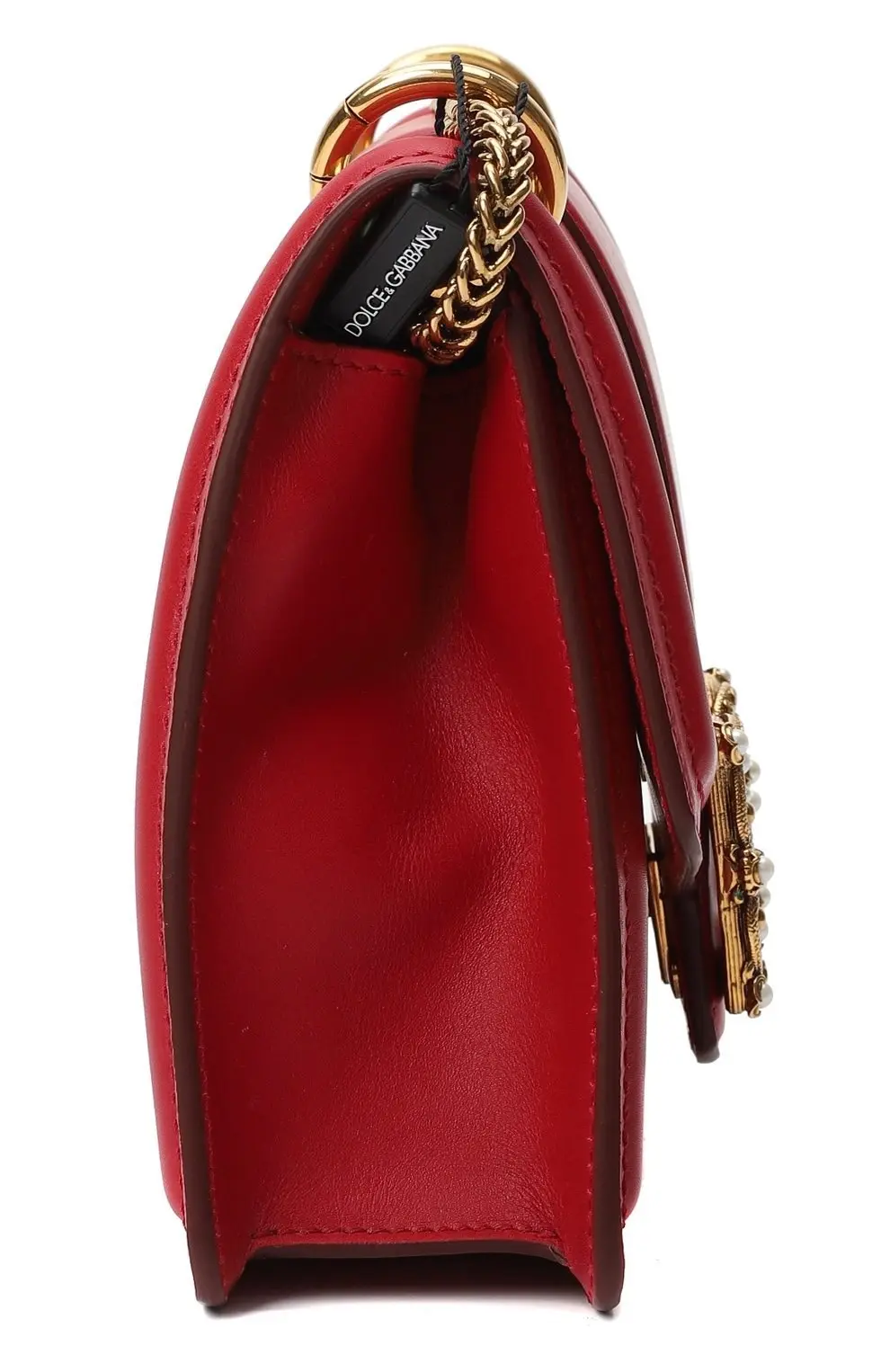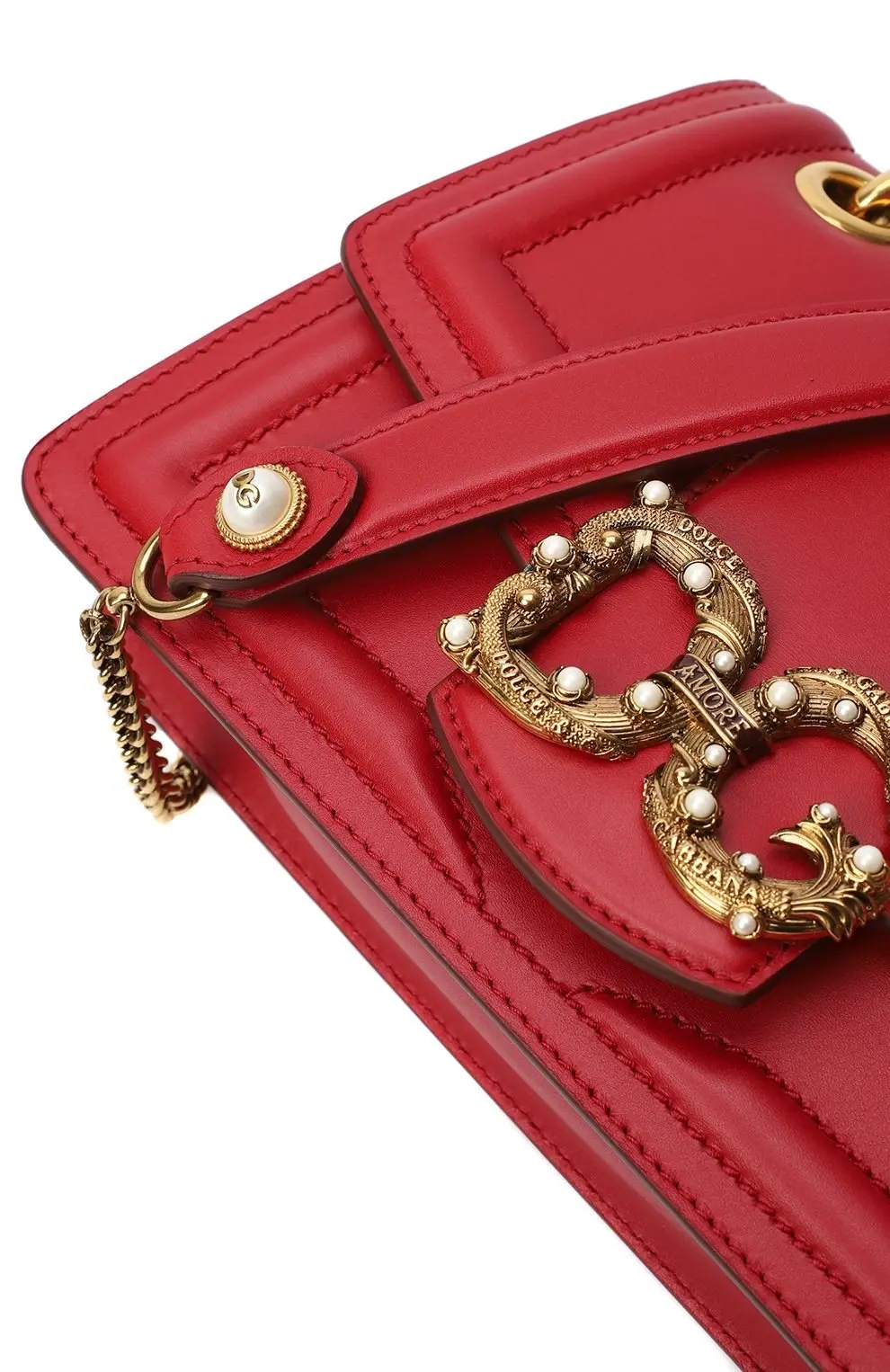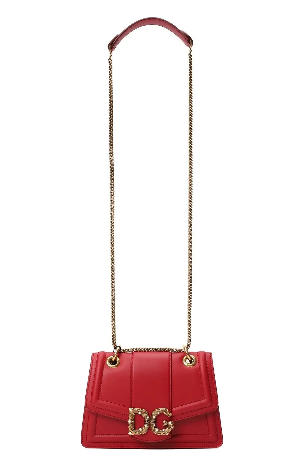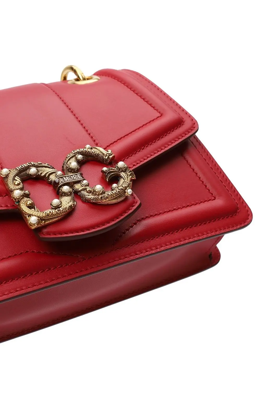 Сумка Amore от Dolce&Gabbana выполнена из гладкой красной кожи. Модель с клапаном и мягкой прострочкой дополнена цепочным плечевым ремнём на металлических кольцах. Акцентом служит объемная пряжка с инициалами бренда, украшенная декоративными жемчужинами. Аксессуар закрывается на магнит и имеет компактное внутреннее отделение.