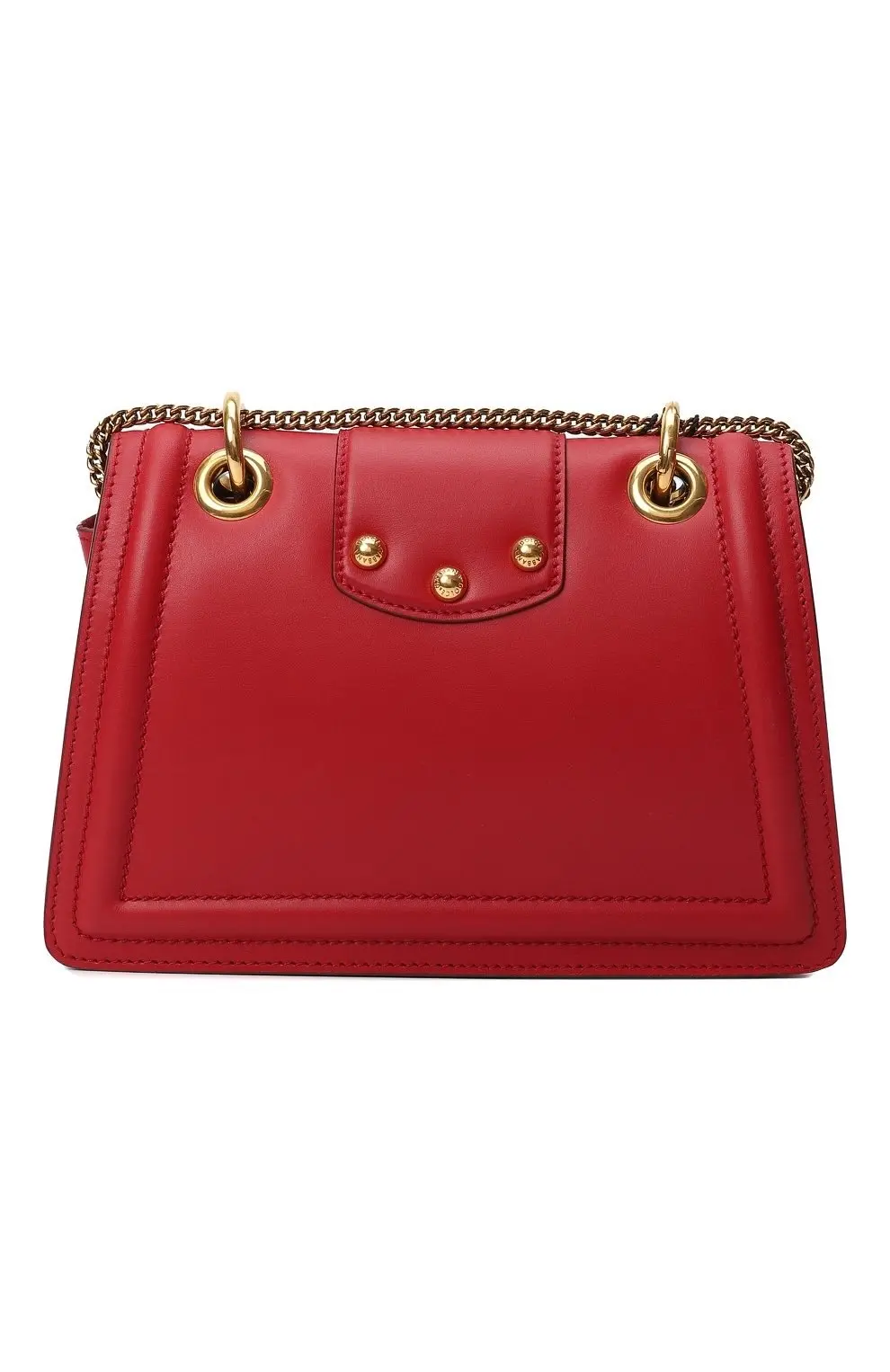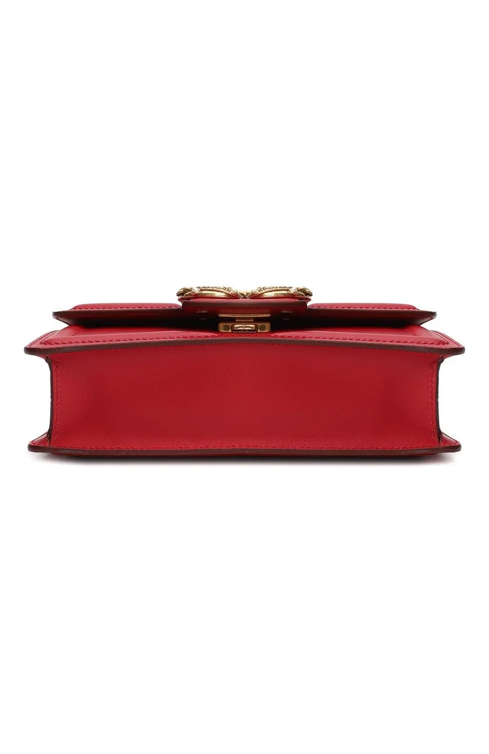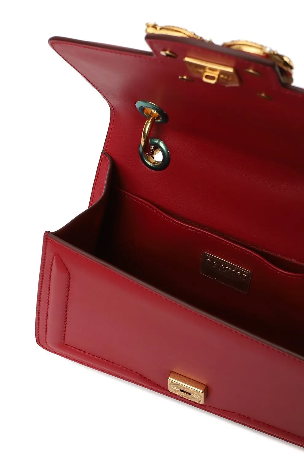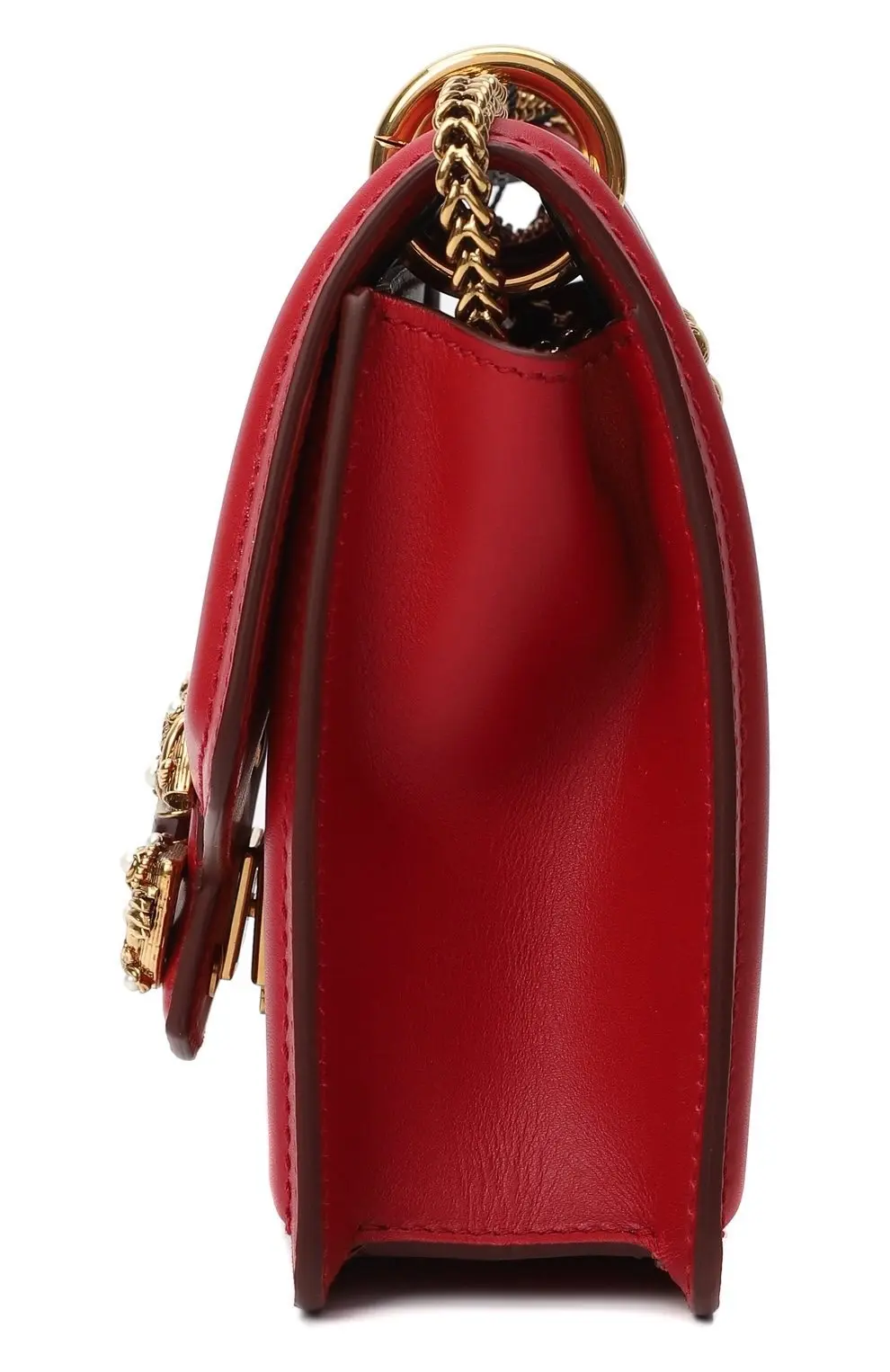 Сумка Amore от Dolce&Gabbana выполнена из гладкой красной кожи. Модель с клапаном и мягкой прострочкой дополнена цепочным плечевым ремнём на металлических кольцах. Акцентом служит объемная пряжка с инициалами бренда, украшенная декоративными жемчужинами. Аксессуар закрывается на магнит и имеет компактное внутреннее отделение.
