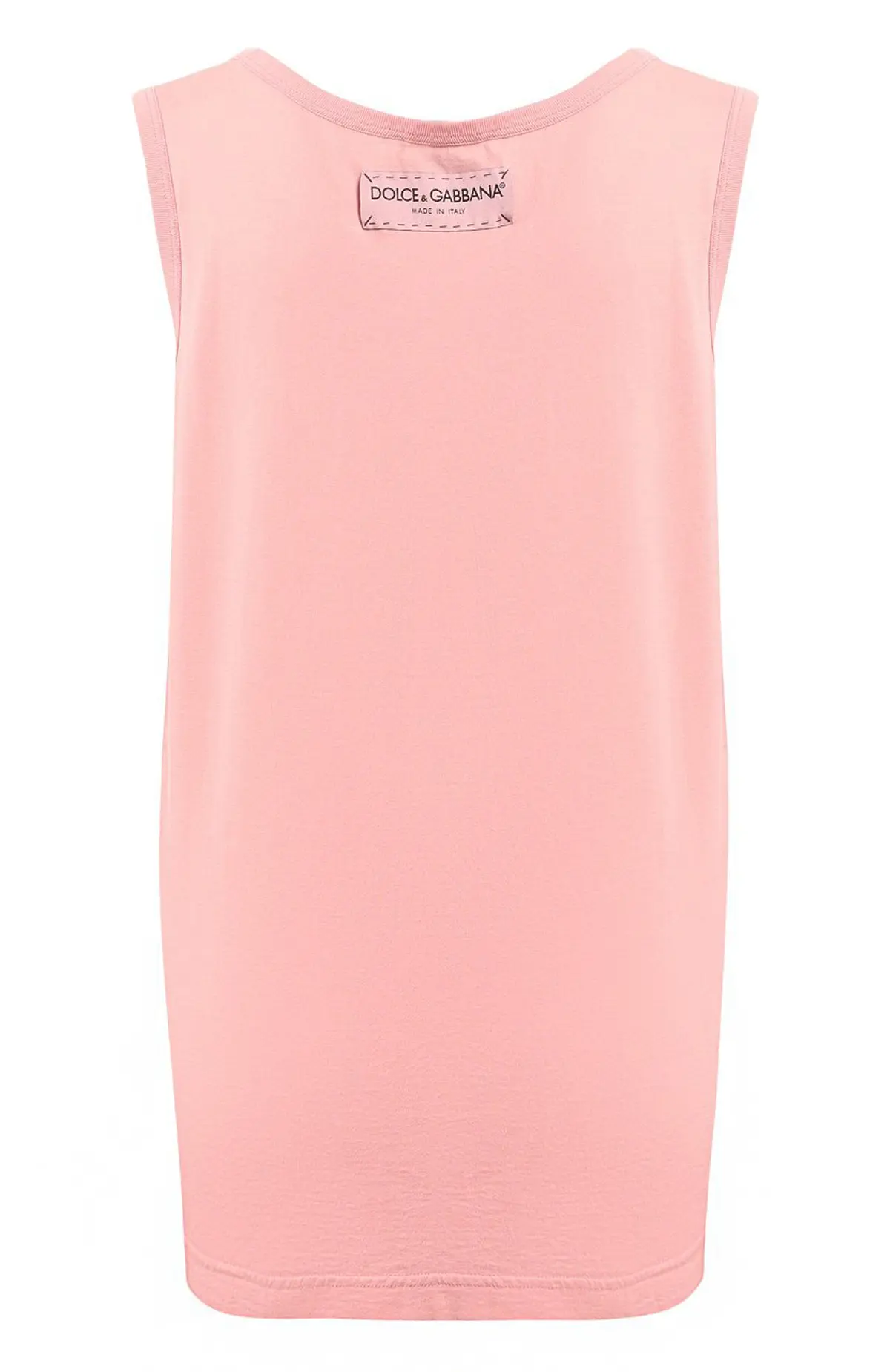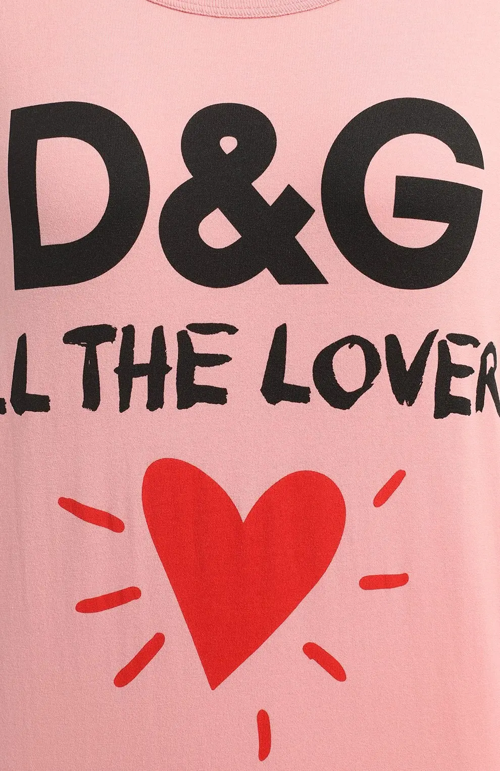 Майка Dolce&Gabbana выполнена из мягкого хлопка розового оттенка. Дизайн украшен крупным принтом с логотипом бренда, надписью All the lovers и красным сердцем. Свободный крой и круглый вырез делают модель комфортной и яркой для летних образов.