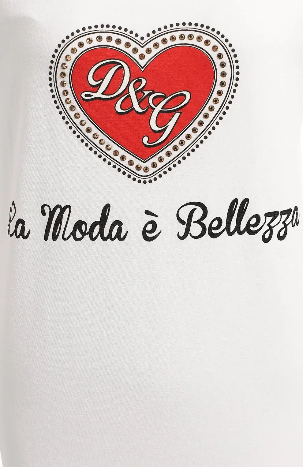 Майка Dolce&Gabbana из мягкого хлопка в белом цвете. Украшена крупным красным сердцем с логотипом D&G и надписью La Moda è Bellezza. Модель с классическим круглым вырезом и прямым силуэтом подчеркивает повседневный стиль и добавляет яркий акцент в образ.