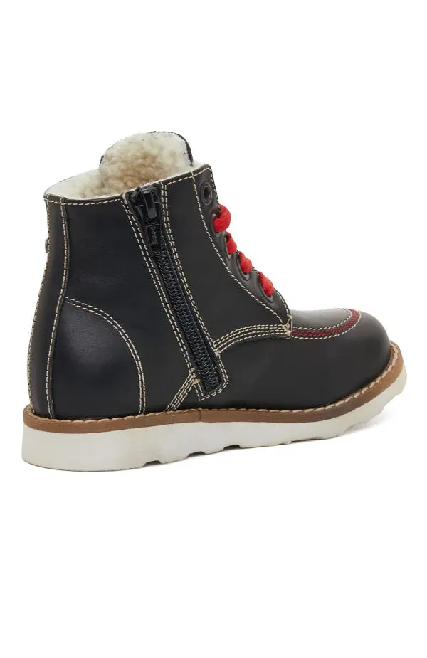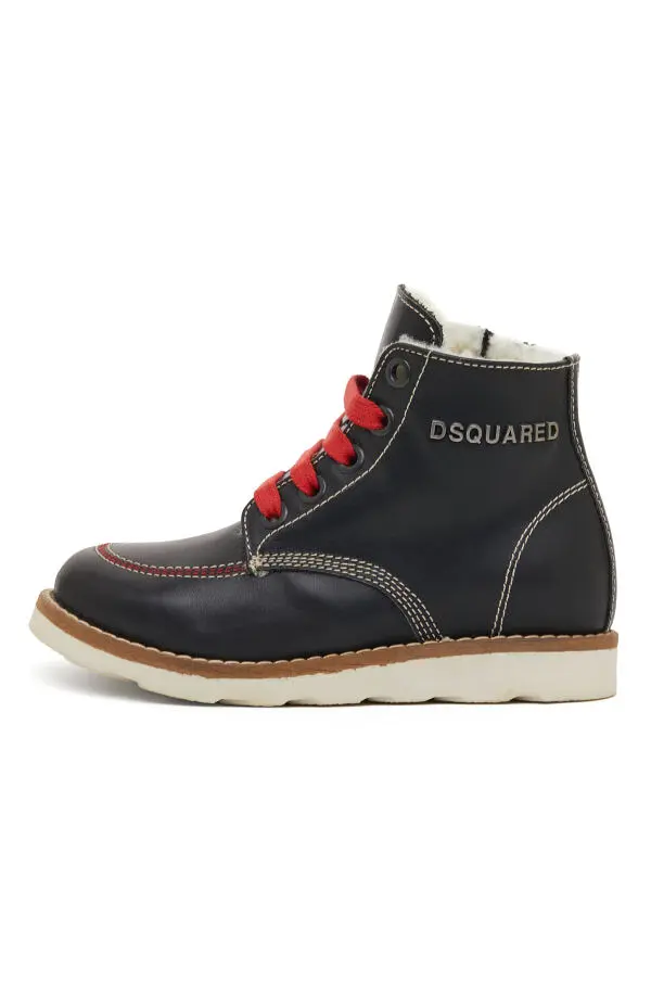 Выполнены из гладкой чёрной кожи с контрастной отстрочкой и акцентными красными шнурками. Тёплая меховая подкладка обеспечивает мягкость и комфортное прилегание. Лёгкая рельефная подошва и усиленный рант подчёркивают утилитарный характер модели и подходят для повседневного города.
