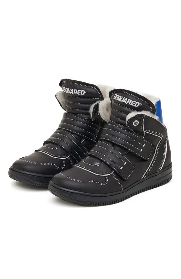 Выполнены из гладкой чёрной кожи с контрастной отстрочкой и объёмной простёжкой. Тёплая шерстяная подкладка и широкие ремни на липучках обеспечивают комфортное прилегание и удобство посадки. Боковая молния упрощает надевание, а резиновая подошва с рельефным протектором подчёркивает спортивный характер модели; контрастная вставка на пятке завершает образ.